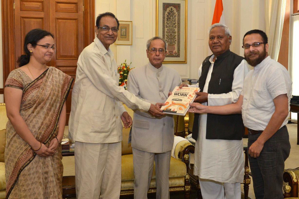 | Caption: | Shri Kariya Munda, MP (LS) alongwith Shri Manohar Puri, President, Antar-Rashtriya Sahayog Nyas, Shri Neeraj Gupta & Ms. Namita Gupta from Center for Democracy and Peace presenting a book 'Representatives at Work', to the President of India, Shri Pranab Mukherjee, at Rashtrapati Bhavan, in New Delhi on June 27, 2015. |