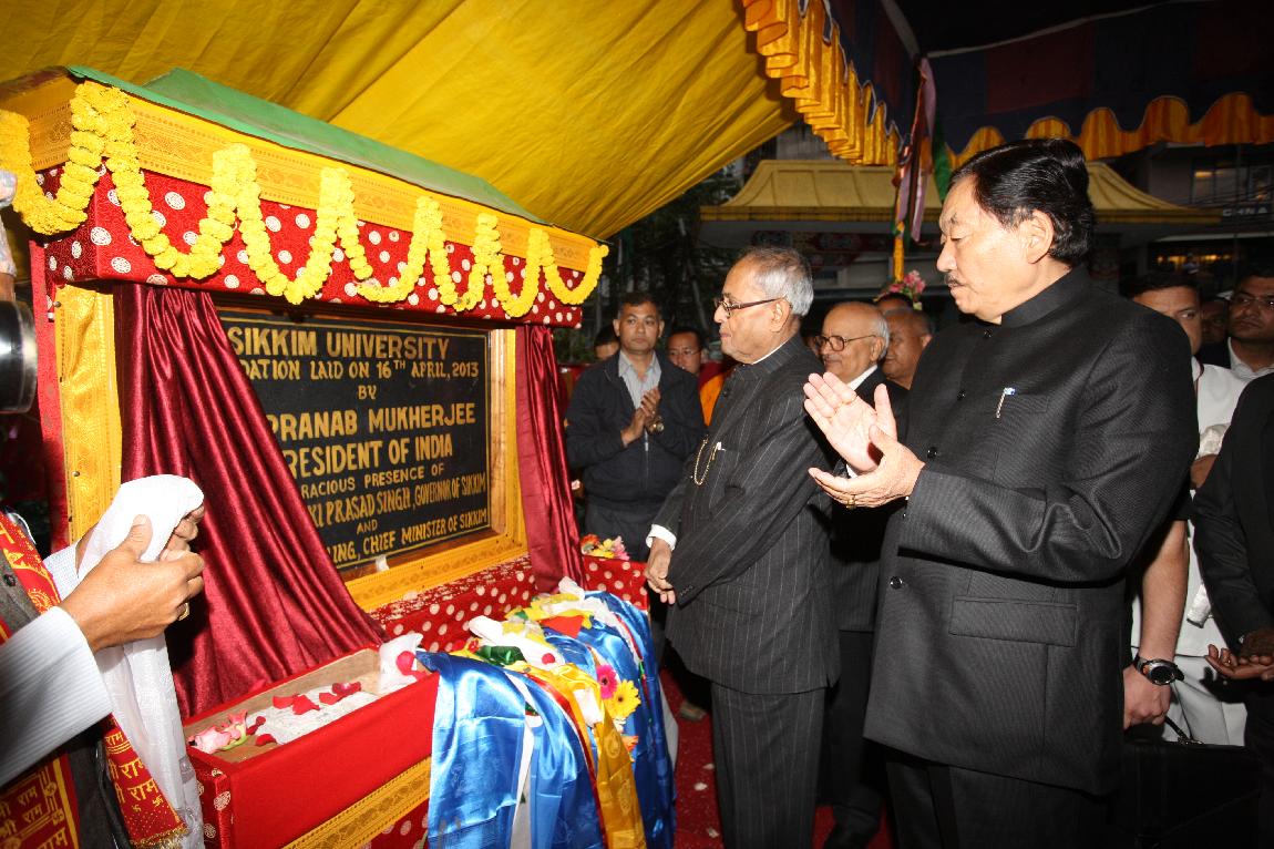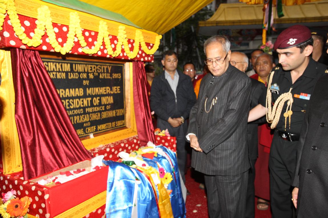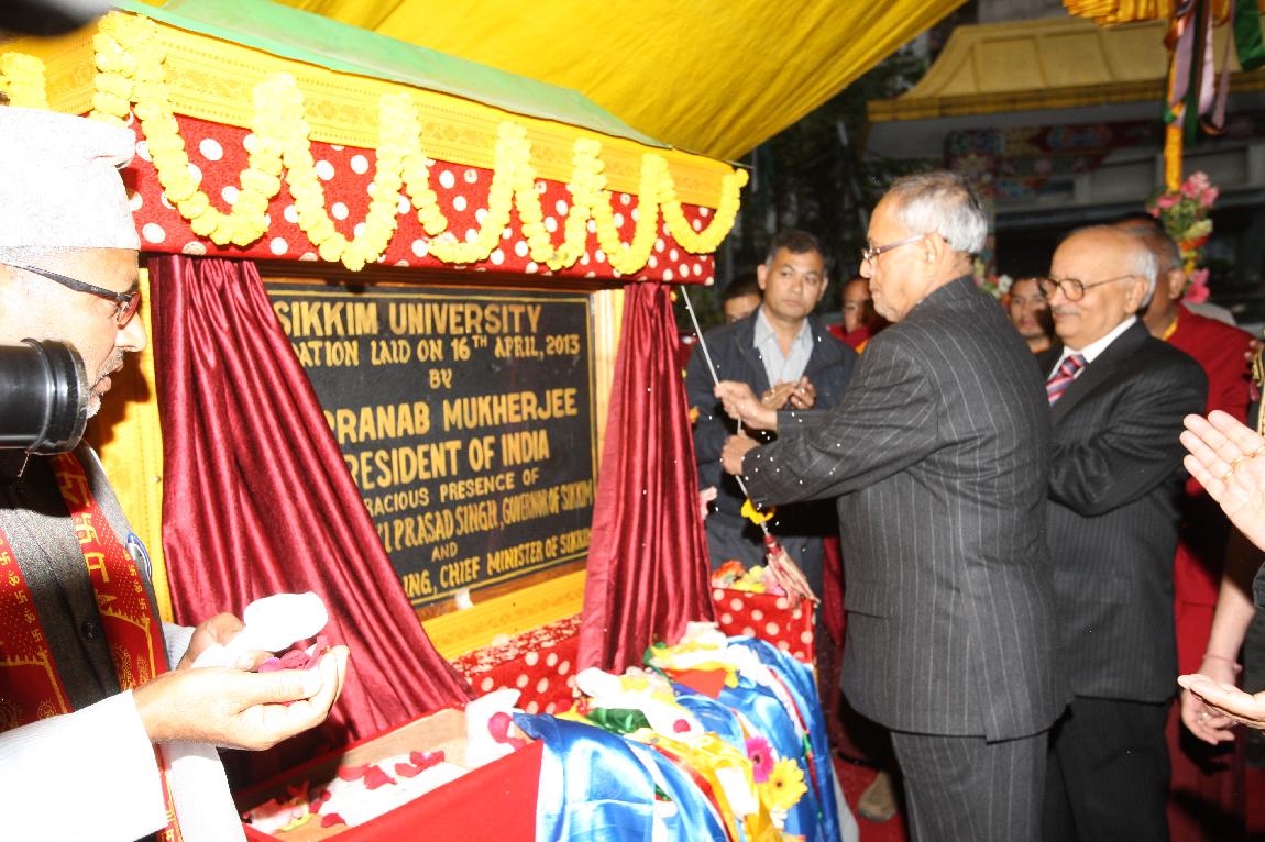 | Caption: | The President of India, Shri Pranab Mukherjee Laying the Foundation Stone of the Sikkim University on April 16, 2013 |