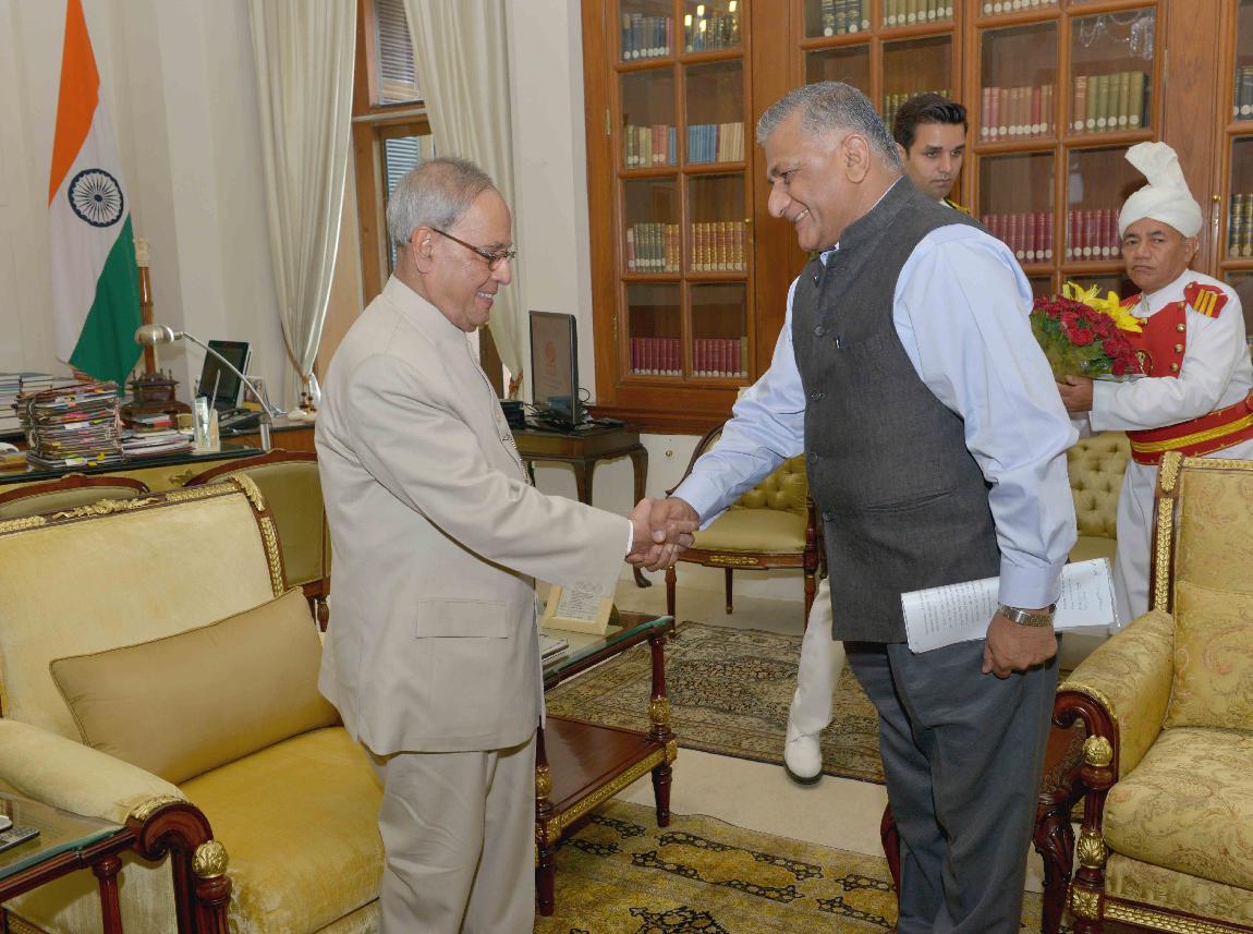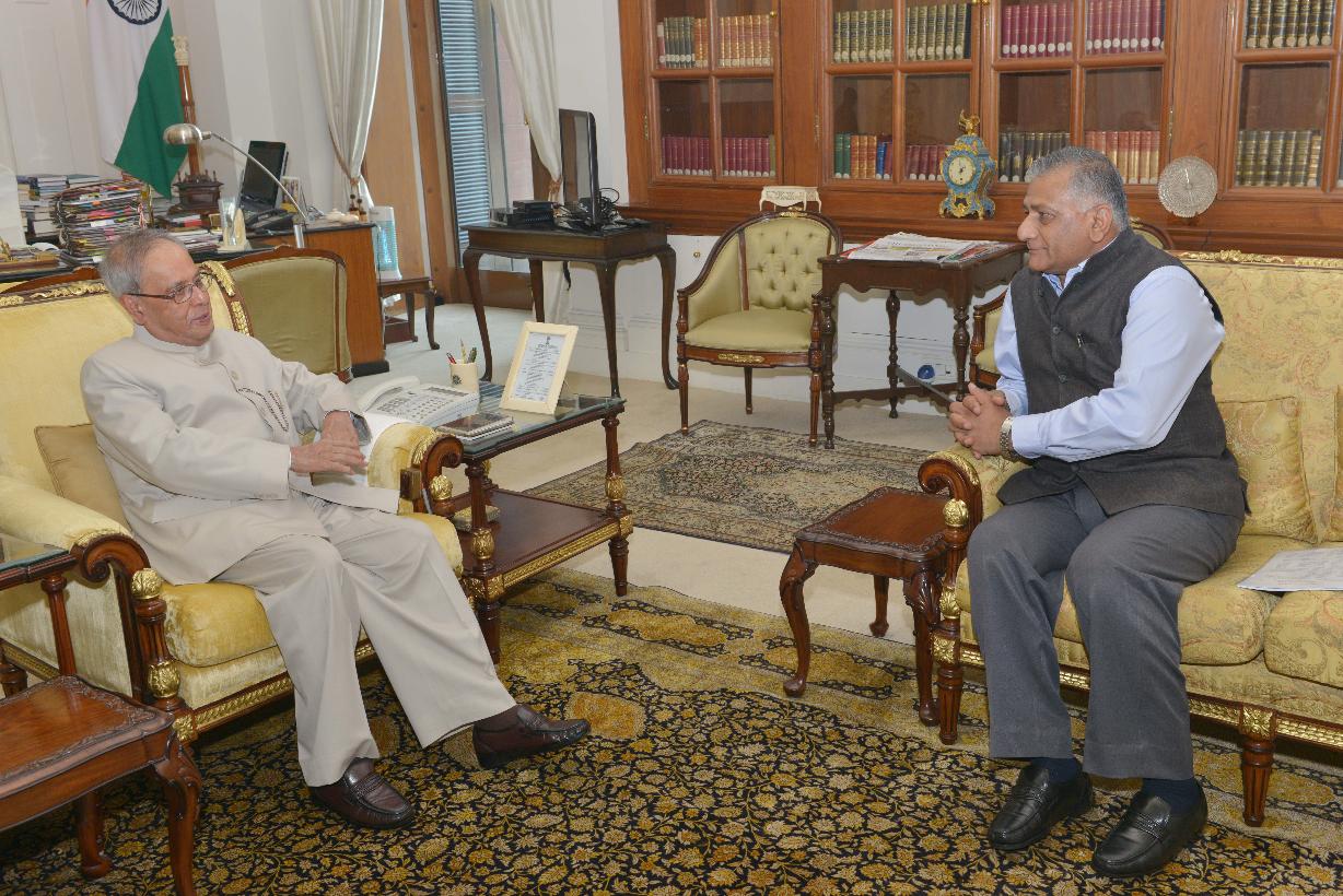 | Caption: | The President of India, Shri Pranab Mukherjee meeting the Minister of State (Independent Charge) for Statistics and Programme Implementation and Minister of State in the Ministry of External Affairs and Ministry of Overseas Indian Affairs, General (Retd.) V.K. Singh, at Rashtrapati Bhavan, in New Delhi on June 27, 2015. |