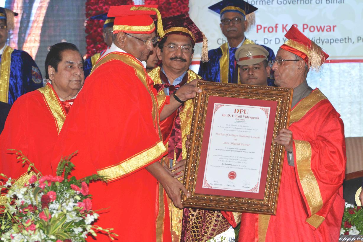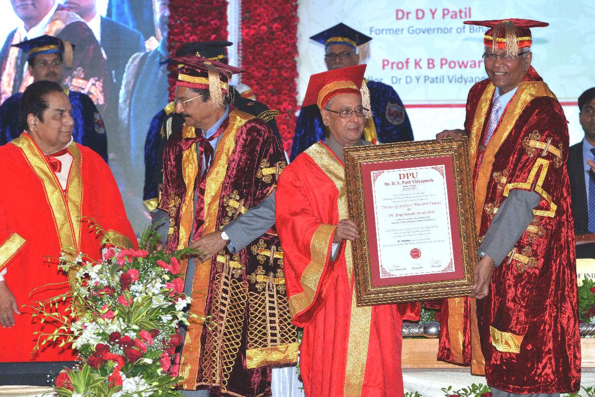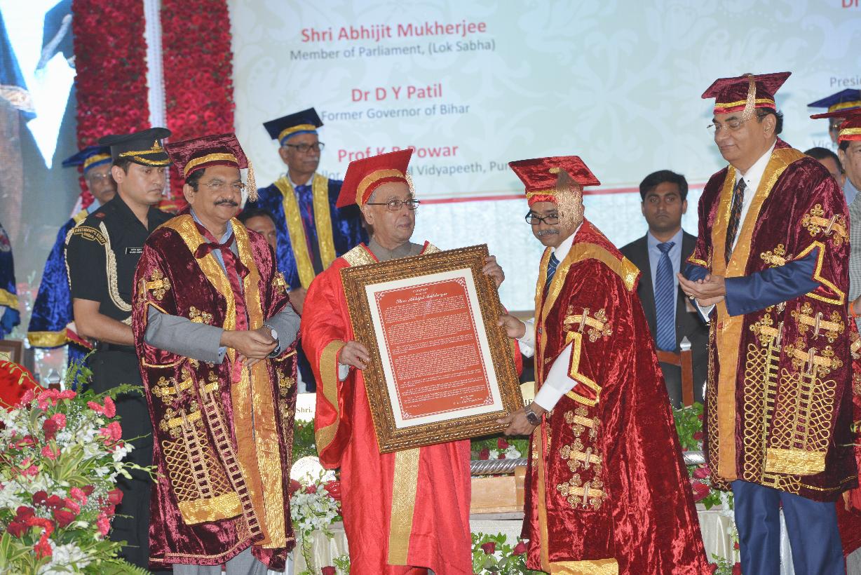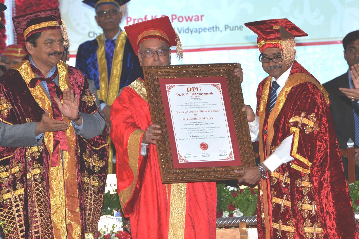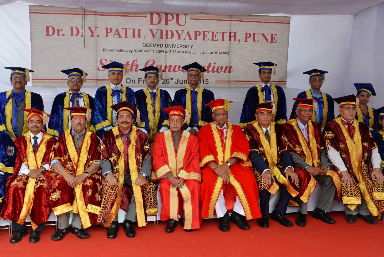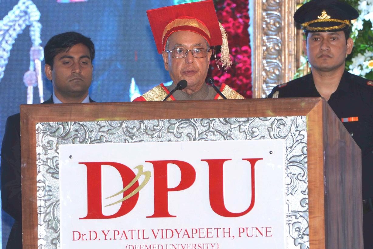 | Caption: | The President of India, Shri Pranab Mukherjee addressing the Sixth Convocation of Dr. D.Y. Patil Vidyapeeth, Pune on June 26, 2015. He also presented the Honoris Causa (D. Litt) to Shri Sharad Pawar, MP (Rajya Sabha), Honoris Causa (D. Sc) to Shri Abhijit Mukherjee, MP (Lok Sabha) and Dr. Raghunath Mashelkar, National Research Professor and Gold Medal to recipients, at the function. |