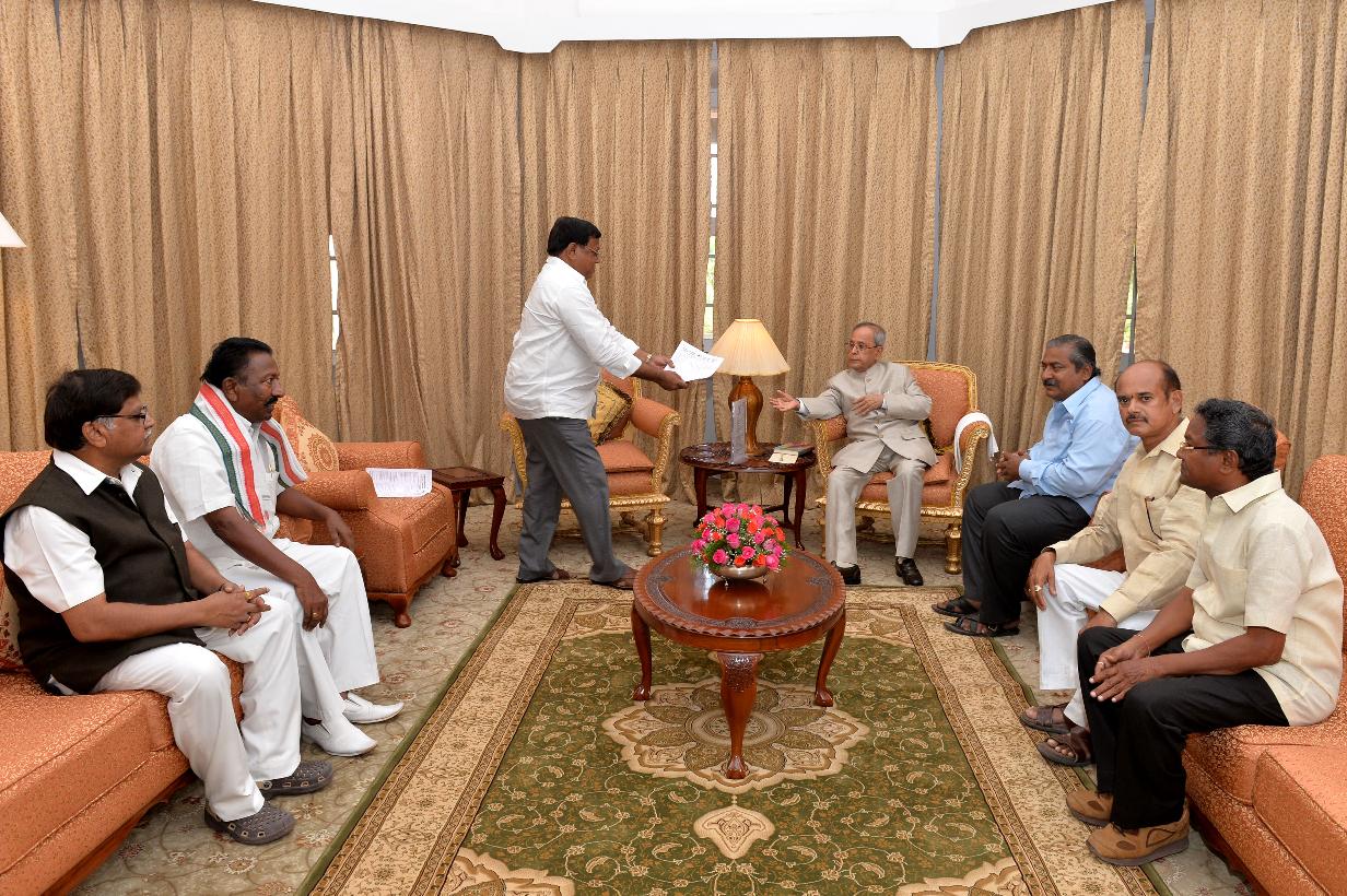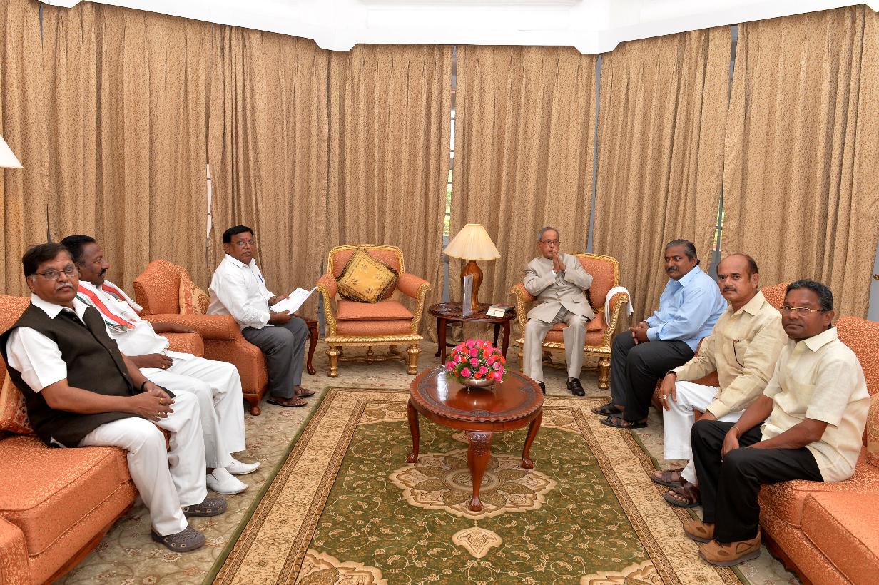 | Caption: | The President of India, Shri Pranab Mukherjee meeting with Shri B. Yadagiri and others, at Rashtrapati Nilayam, Bolarum, in Secunderabad on July 04, 2015. |
