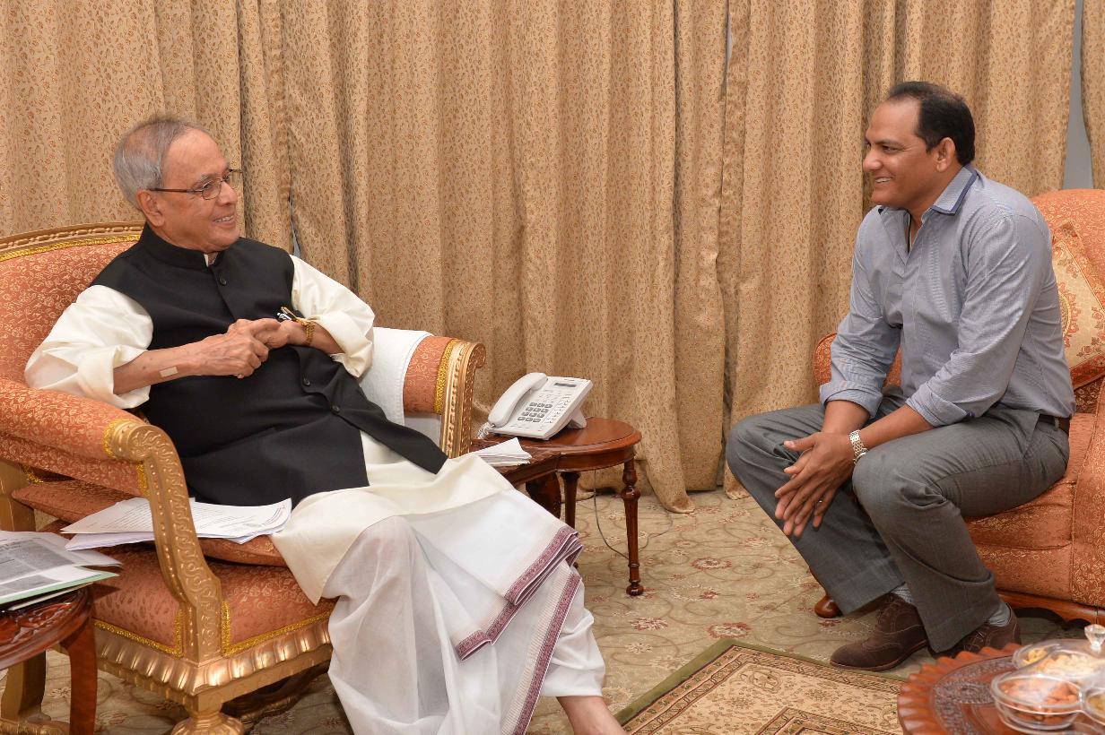 | Caption: | The President of India, Shri Pranab Mukherjee meeting with Mohammad Azharuddin, Ex-MP, at Rashtrapati Nilayam, Bolarum, in Secunderabad on July 06, 2015. |