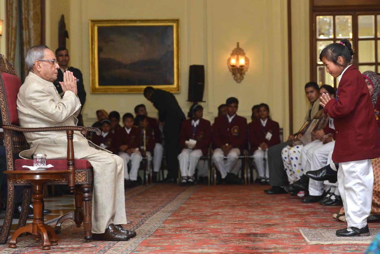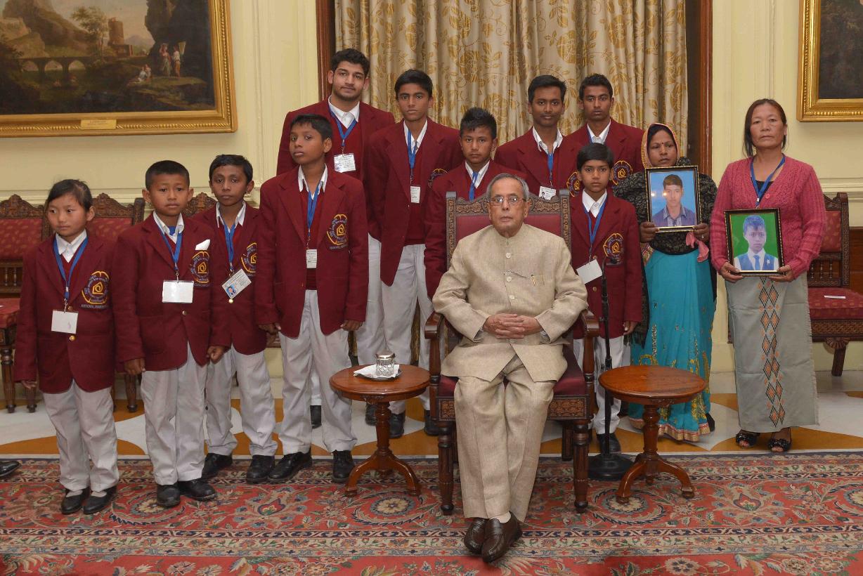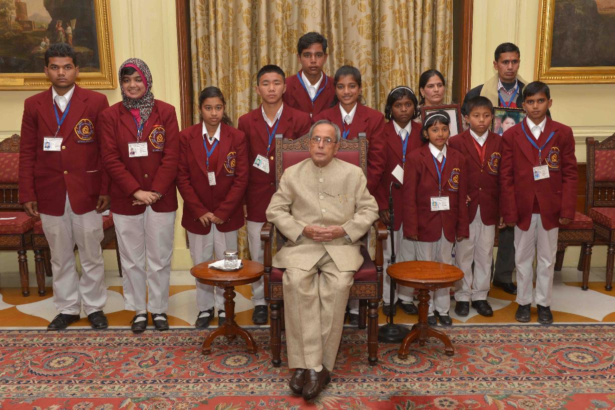 | Caption: | The President of India, Shri Pranab Mukherjee, meeting with the National Bravery Award winner children, at a function, at Rashtrapati Bhavan, in New Delhi on January 22, 2015 |