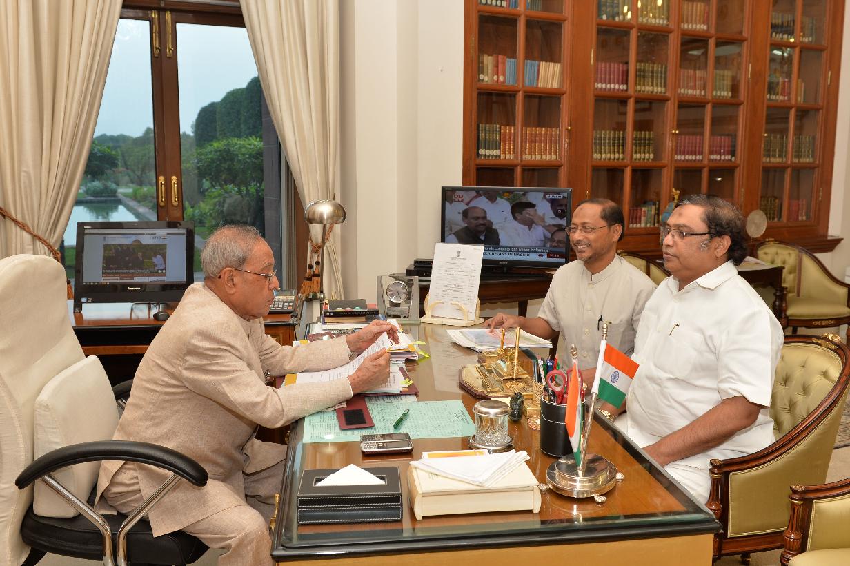 | Caption: | The President of India, Shri Pranab Mukherjee meeting the Managing Director, Jangipur Bengal Mega Food Park Ltd., Shri Amirul Islam and Shri Azizur Rahman, at Rashtrapati Bhavan, in New Delhi on July 14, 2015. |