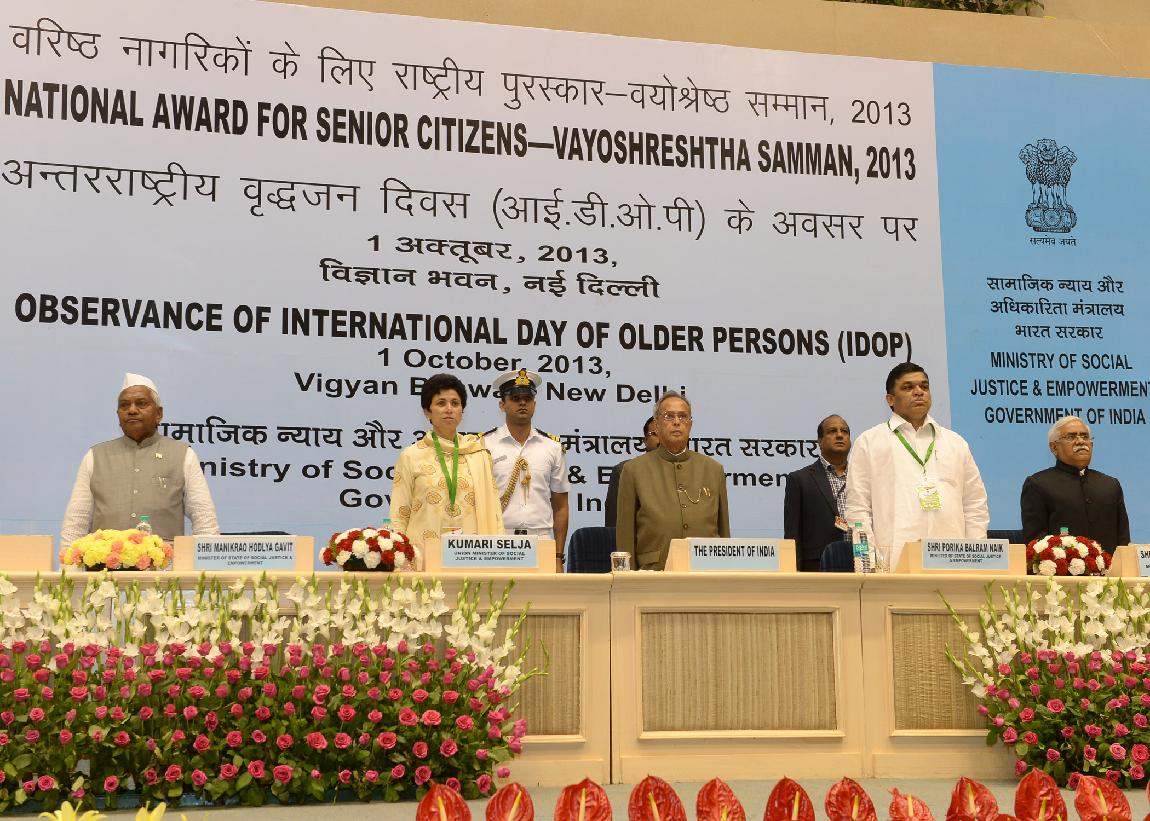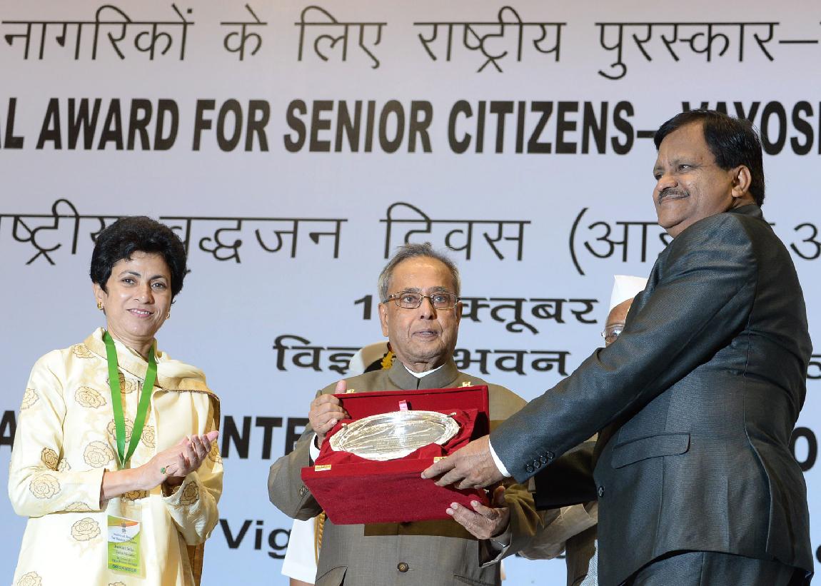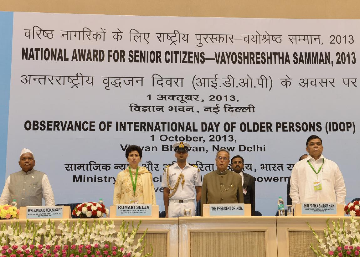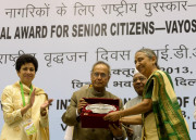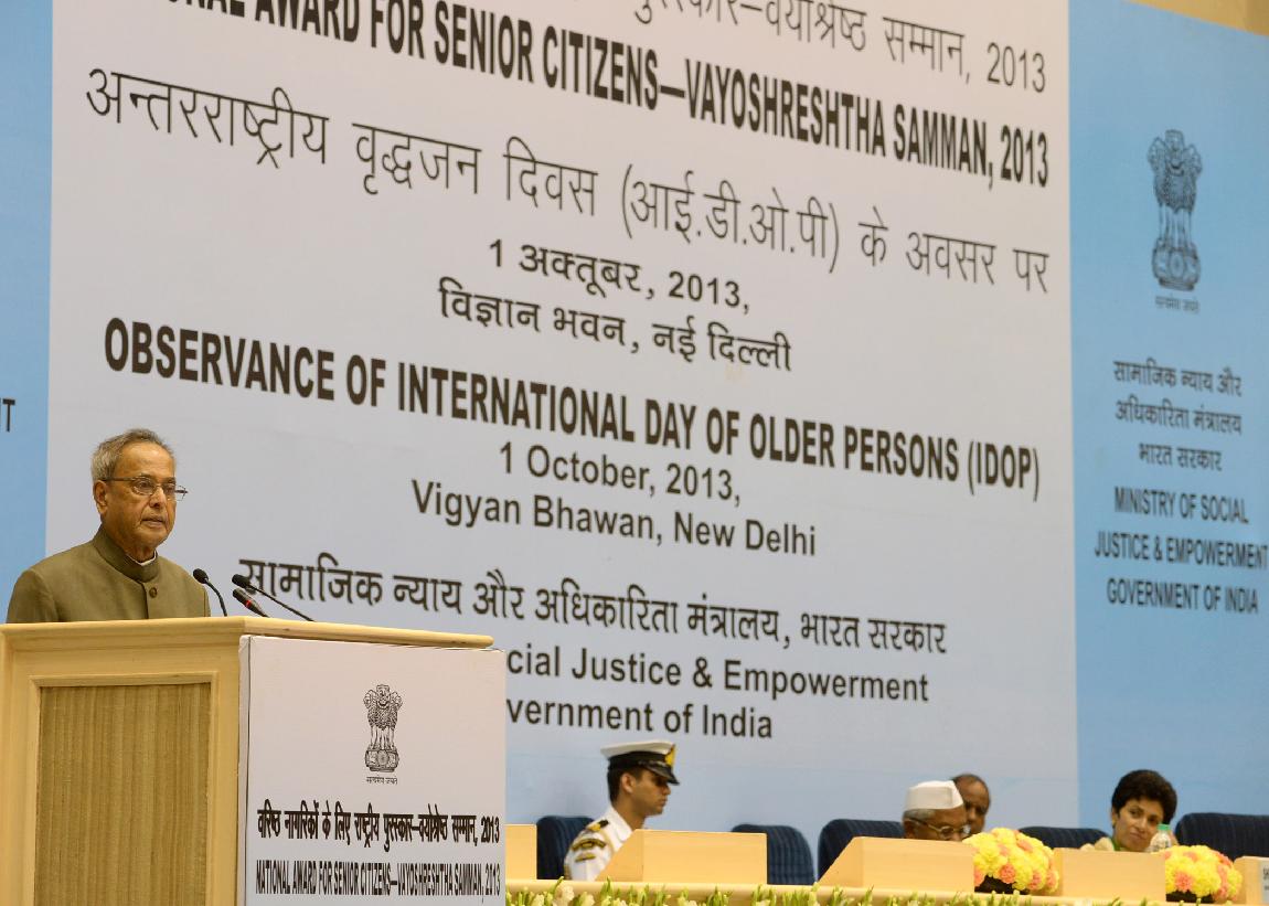 | Caption: | The President of India, Shri Pranab Mukherjee presenting the National Awards for Senior Citizens - Vayoshreshtha Samman on the occasion of International Day Older Persons at Vigyan Bhavan in New Delhi on Oct 01, 2013 |