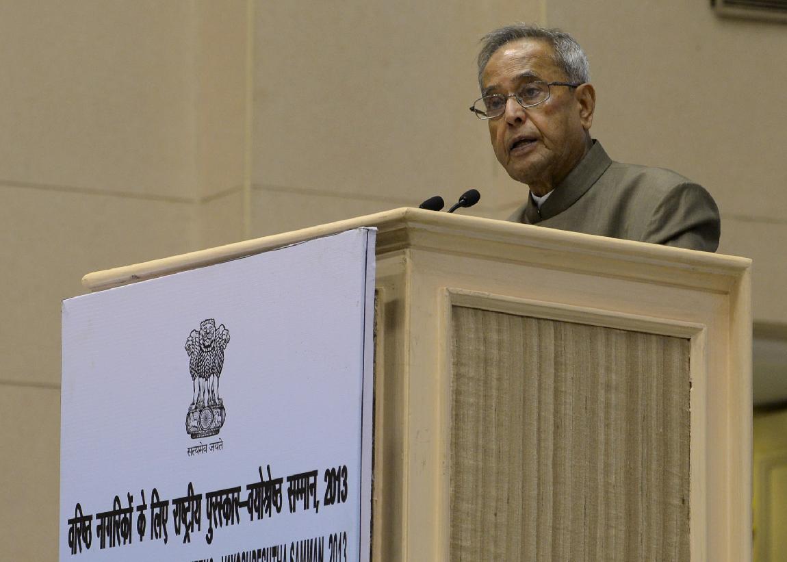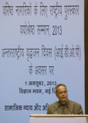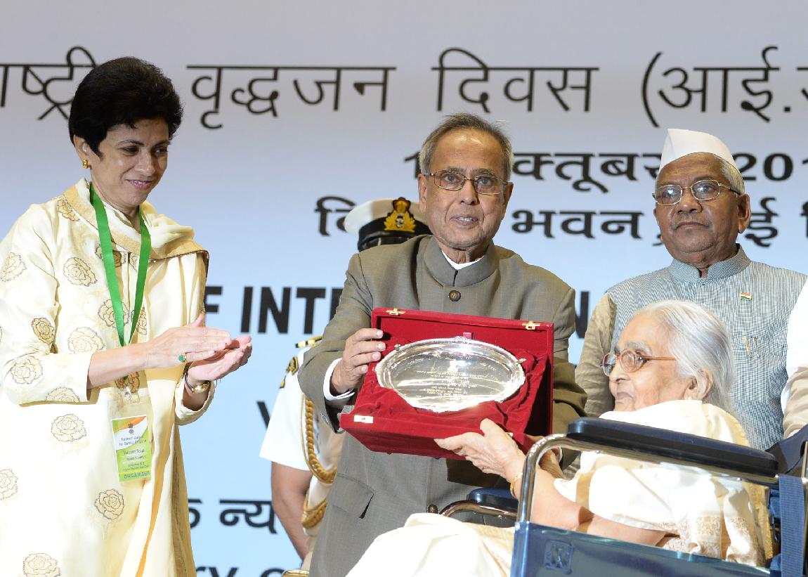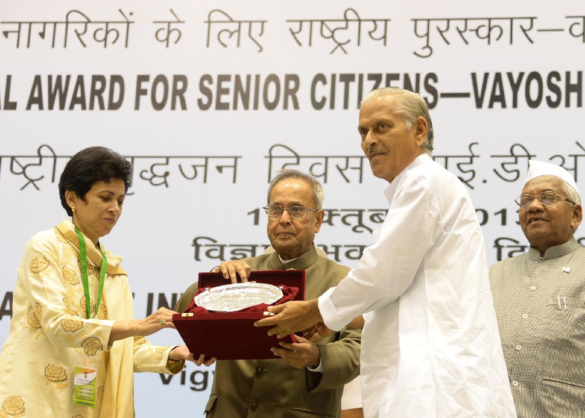 | Caption: | The President of India, Shri Pranab Mukherjee presenting the National Awards for Senior Citizens - Vayoshreshtha Samman on the occasion of International Day Older Persons at Vigyan Bhavan in New Delhi on Oct 01, 2013 |