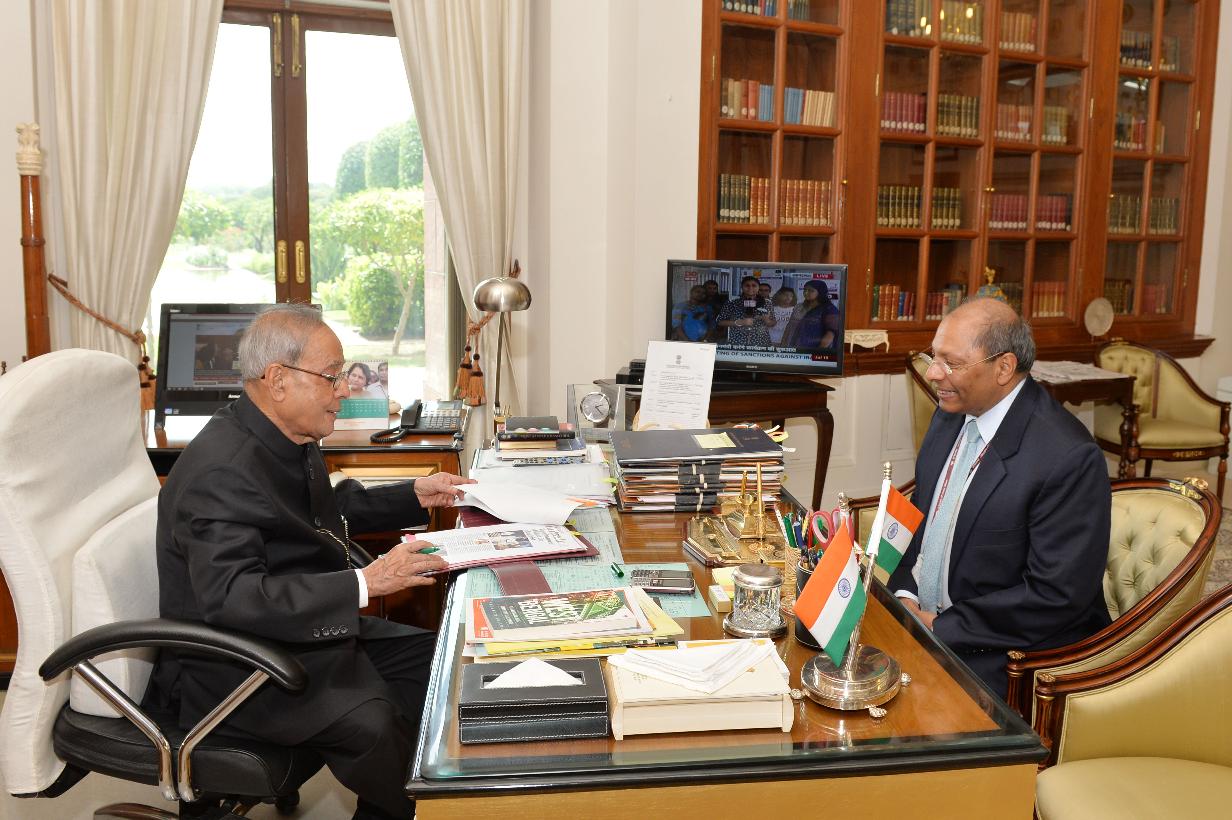 | Caption: | The President of India, Shri Pranab Mukherjee meeting the Ambassador of India to Myanmar, Shri Gautam Mukhopadhaya, at Rashtrapati Bhavan, in New Delhi on July 15, 2015. |