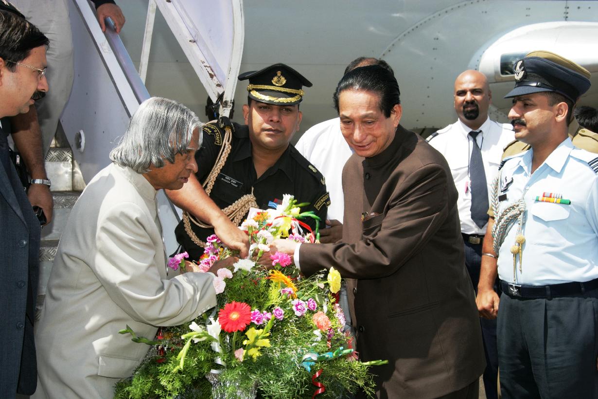 | Caption: | The President of India, Dr A P J Abdul Kalam being welcomed by the Governor of Goa, Shri S C Jamir at Naval Enclave Airport, Dabolim in Goa on Oct 18, 2005 |