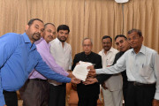 | Caption: | The President of India, Shri Pranab Mukherjee meeting with Shri Paduri Srinivas and others, at Rashtrapati Nilayam, Bolarum, in Secunderabad on July 07, 2015. |