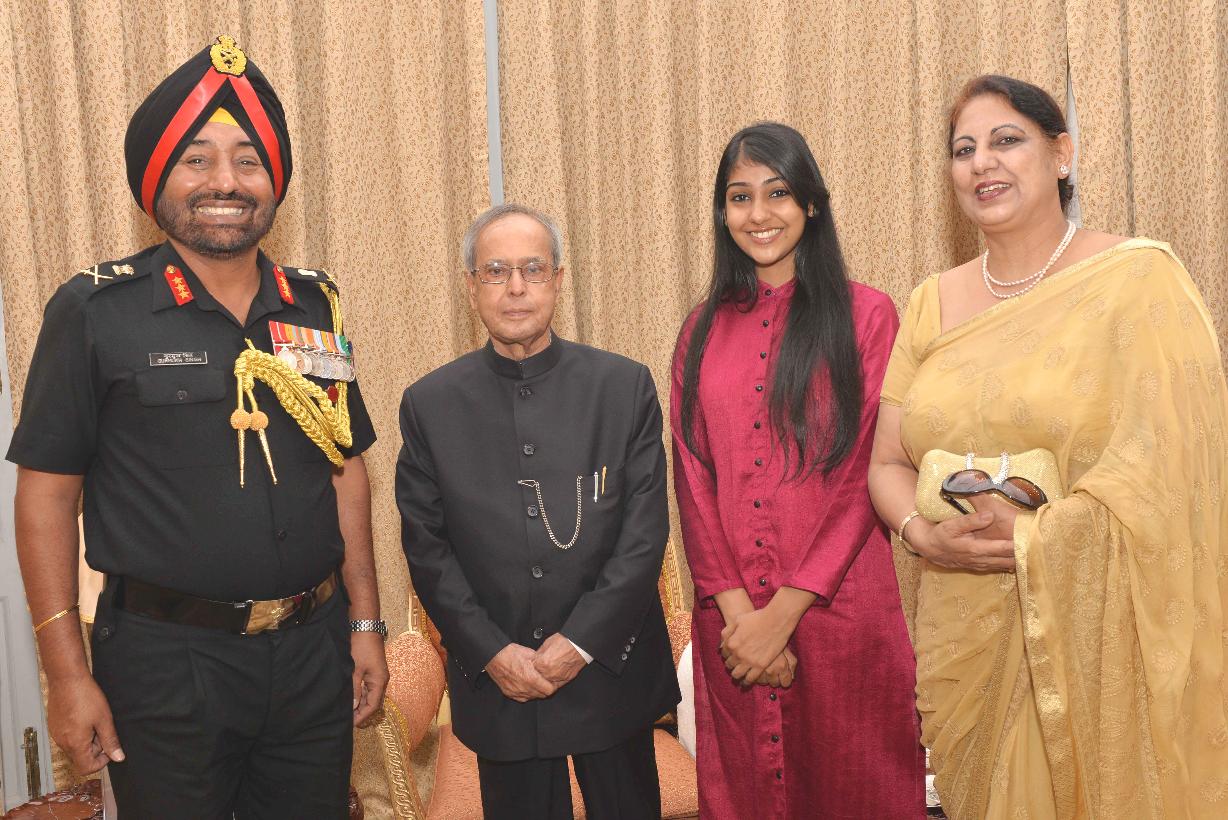 | Caption: | The President of India, Shri Pranab Mukherjee meeting with Lt. Gen. Gurmukh Singh and others, at Rashtrapati Nilayam, Bolarum, in Secunderabad on July 02, 2015. |