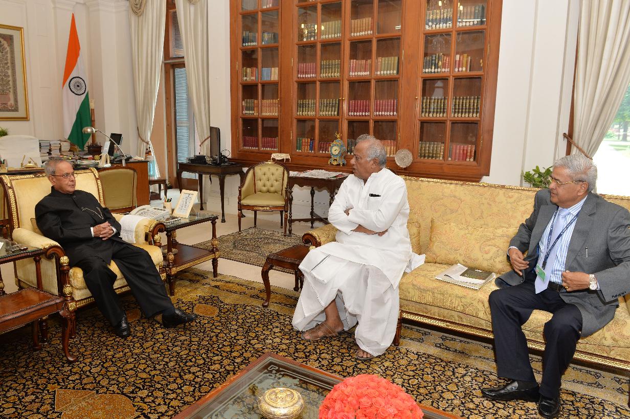 | Caption: | The President of India, Shri Pranab Mukherjee meeting Prof. Saugata Roy, MP (LS) and the Chairman, Maulana Abul Kalam Azad Institute of Asian Studies, Kolkata, Shri Sitaram Sharma, at Rashtrapati Bhavan, in New Delhi on July 15, 2015. |