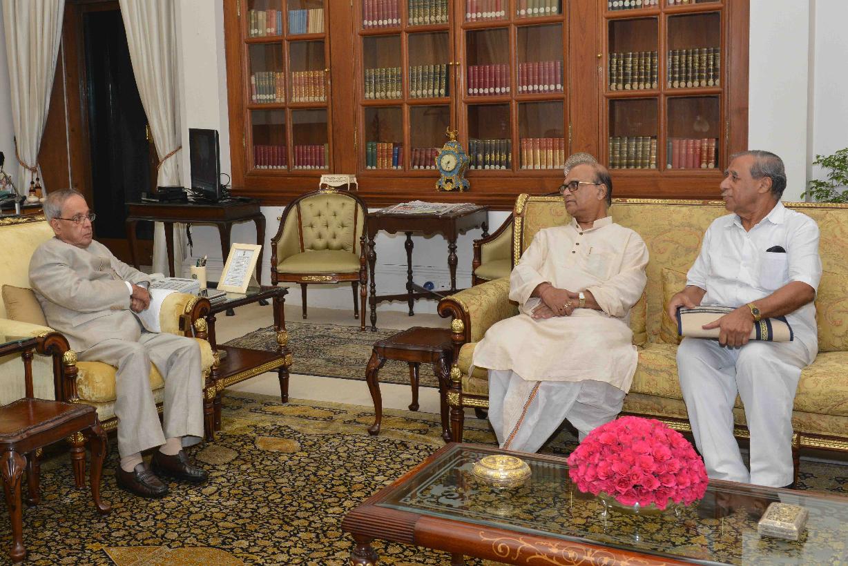 | Caption: | The President of India, Shri Pranab Mukherjee meeting with Shri Pradeep Bhattacharya, MP (LS) and Shri Sankar Kumar, President, Harijan Sevak Sangh, Delhi, at Rashtrapati Bhavan, in New Delhi on July 22, 2015. |