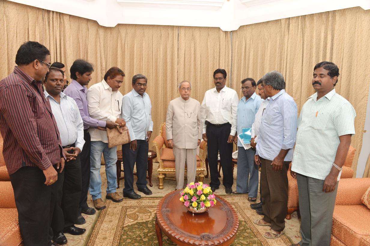 | Caption: | The President of India, Shri Pranab Mukherjee meeting with Shri G. Muralidhar Rao and others, at Rashtrapati Nilayam, Bolarum, in Secunderabad on July 06, 2015. |