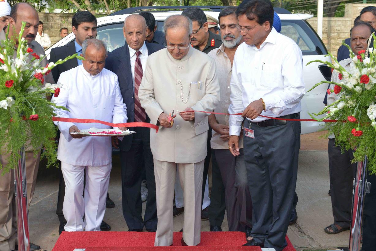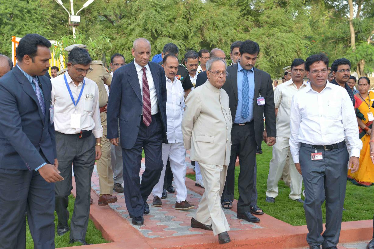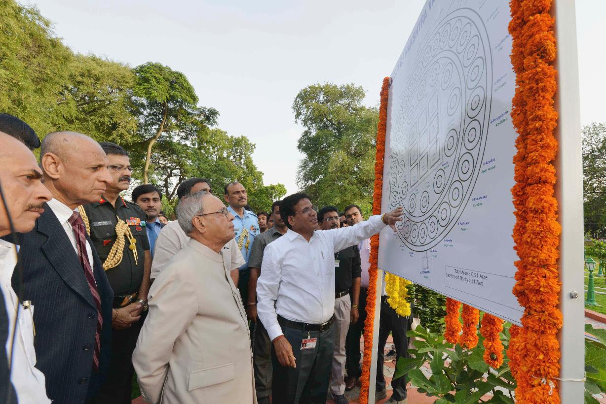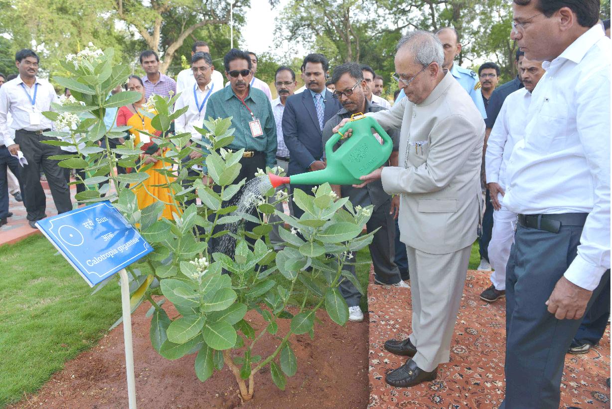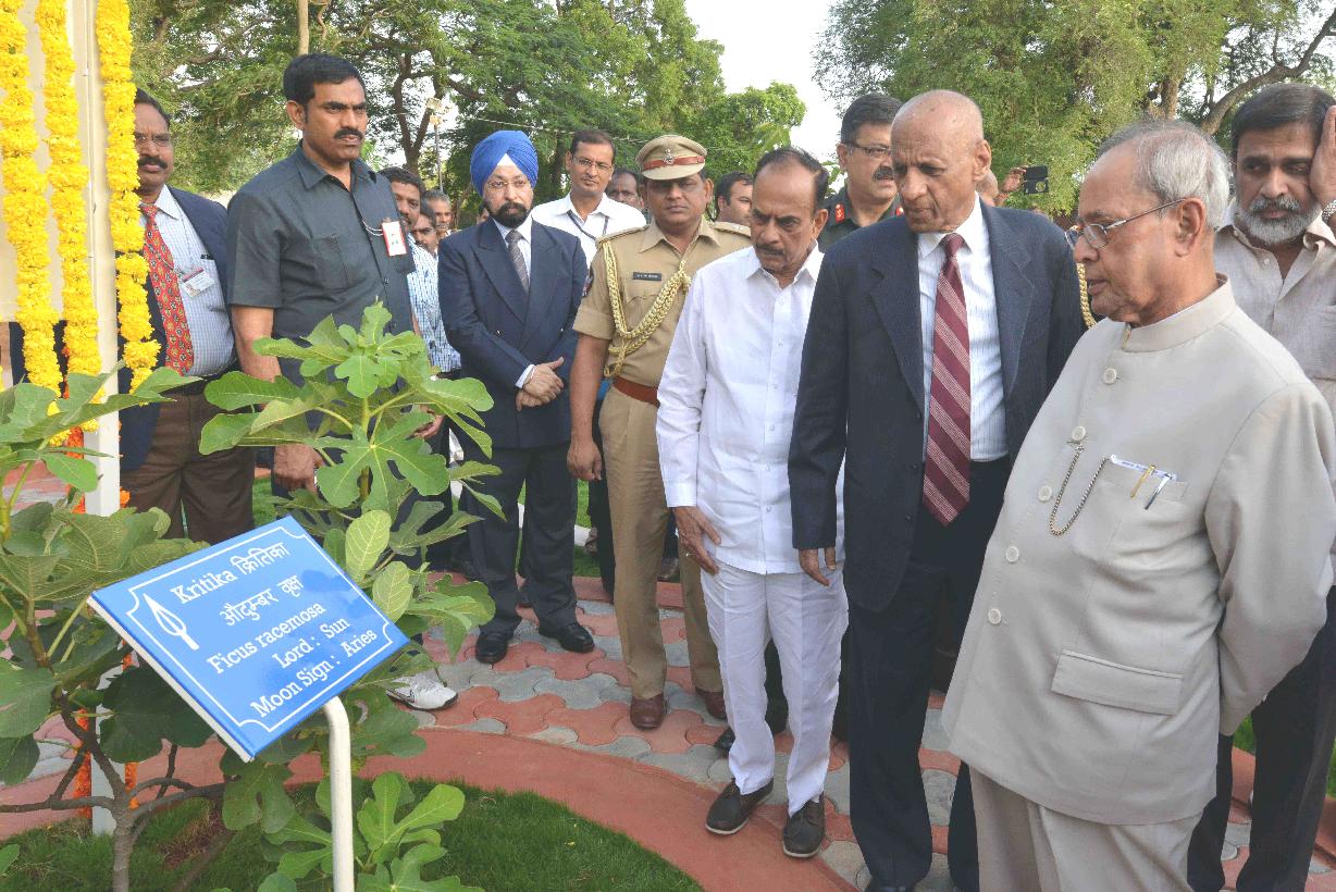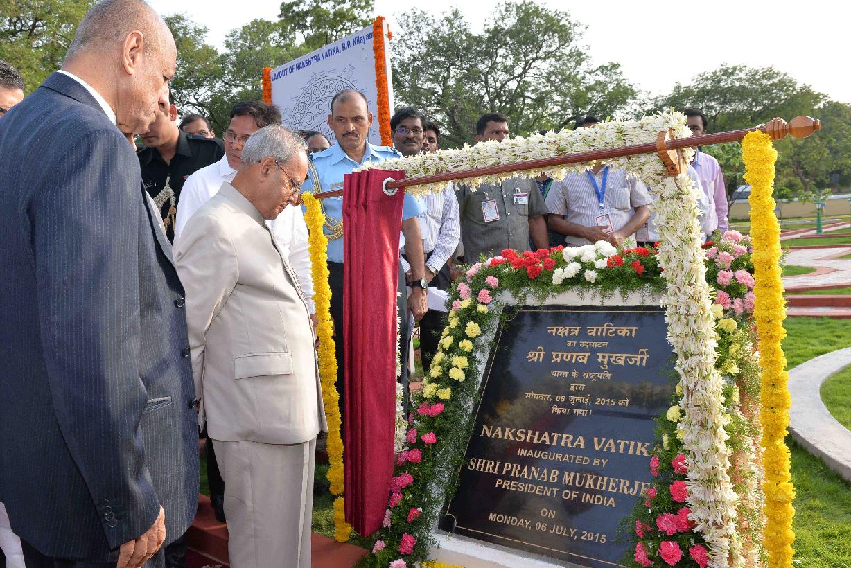 | Caption: | The President of India, Shri Pranab Mukherjee inaugurating the Nakshtra Vatika (Nakshtra Garden), at Rashtrapati Nilayam, Bolarum, in Secunderabad on July 06, 2015. The Governor of Telangana and Andhra Pradesh, Shri E.S.L. Narasimhan is also seen. |