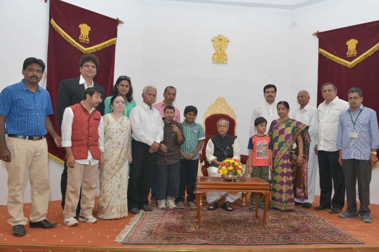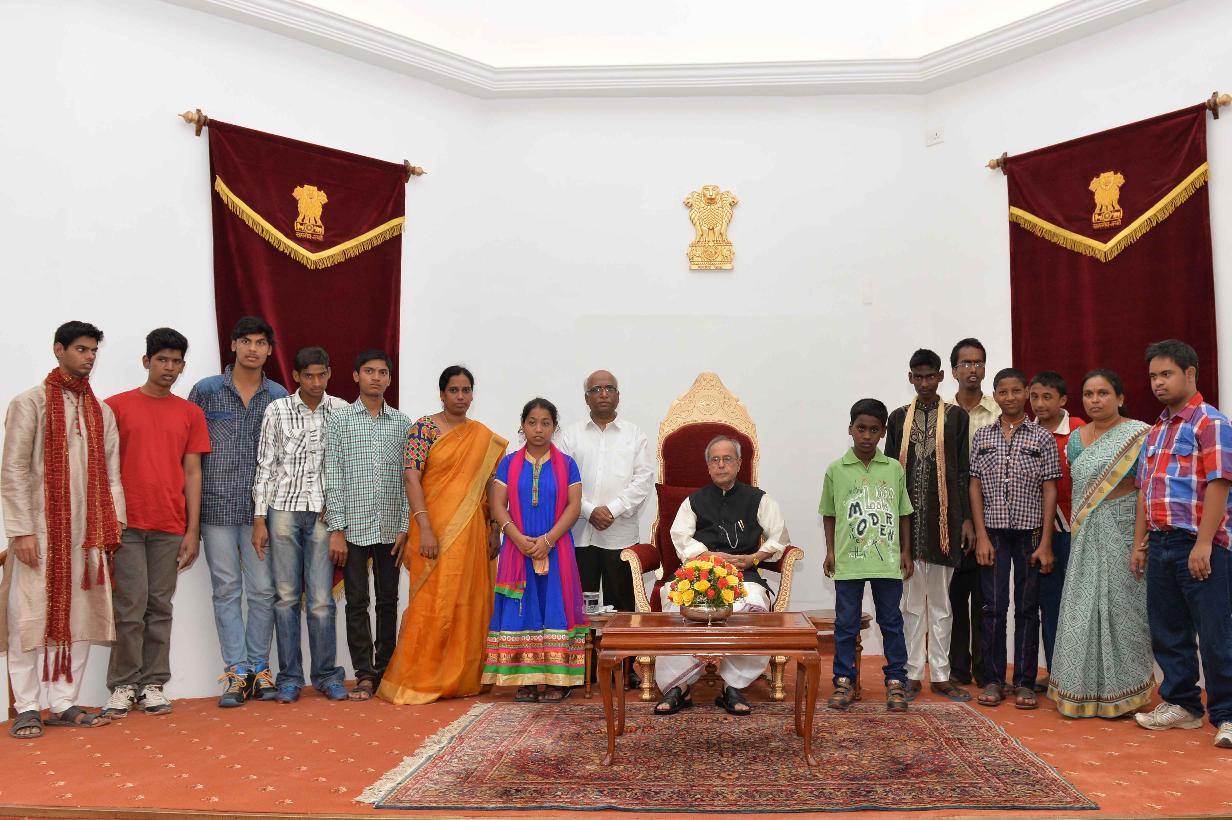 | Caption: | The President of India, Shri Pranab Mukherjee meeting with a Delegation of 20 Intellectually disabled persons, led by Shri E.V.Ramesh Chancer, at Rashtrapati Nilayam, Bolarum, in Secunderabad on July 06, 2015. |