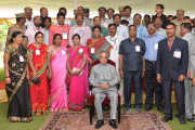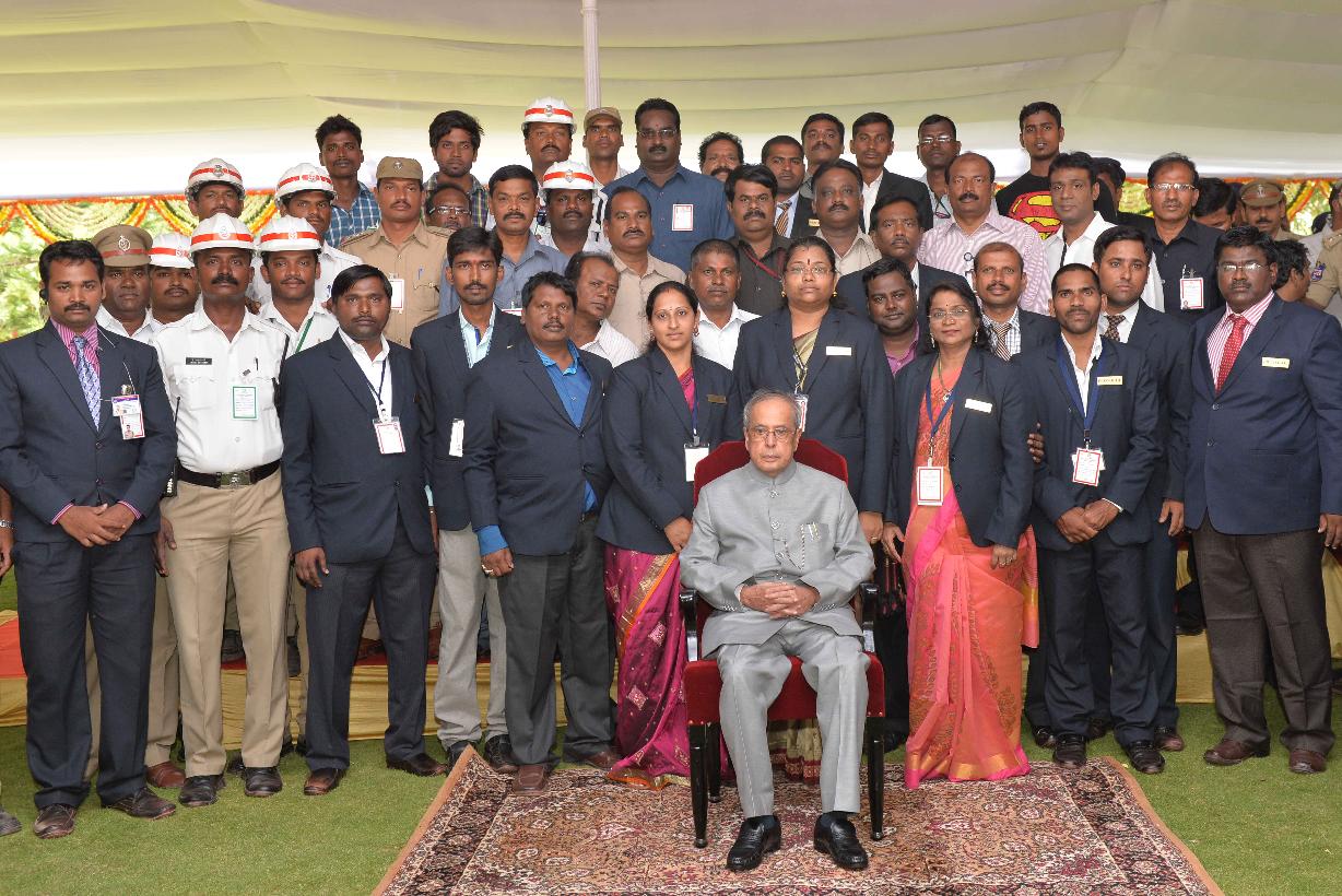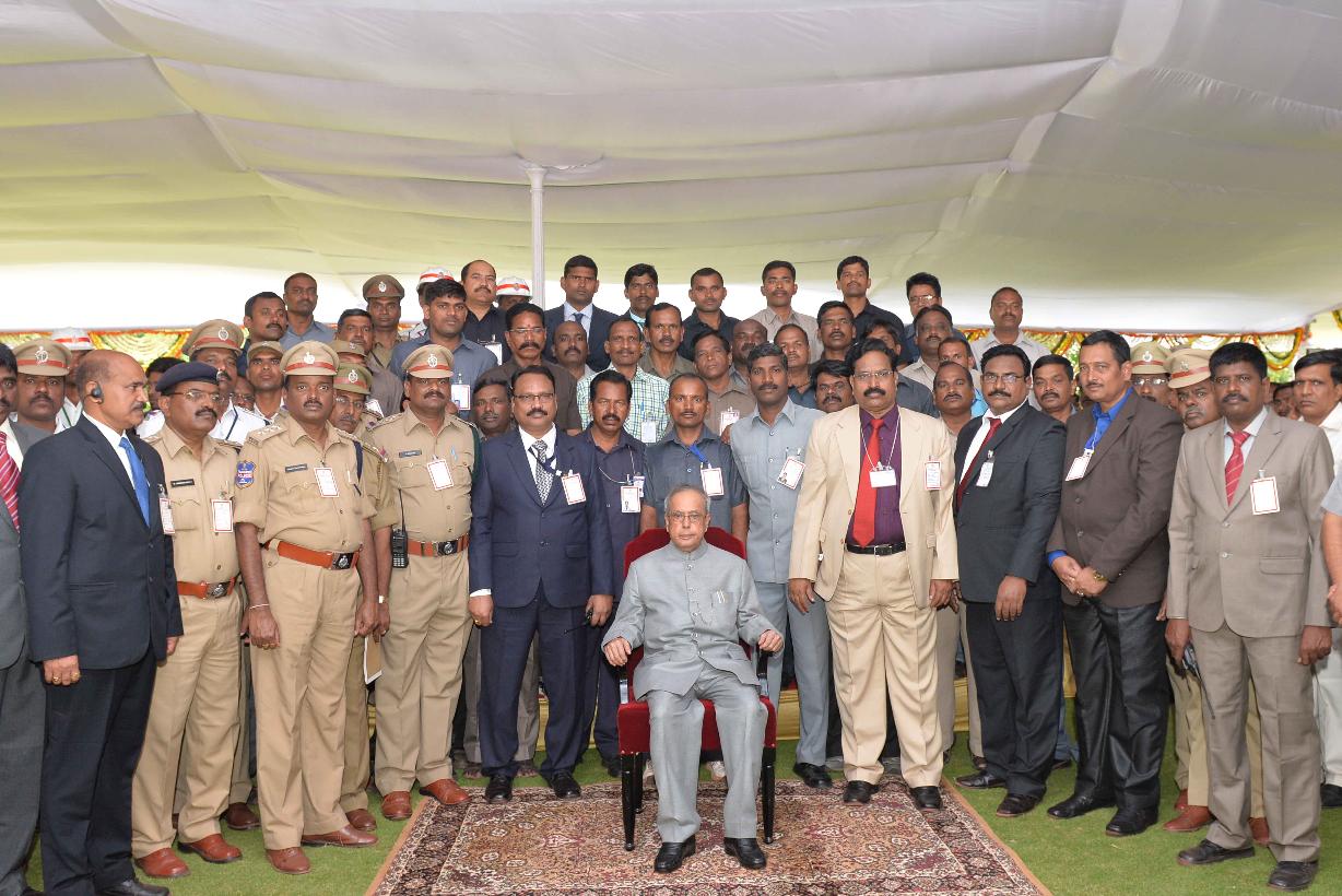 | Caption: | The President of India, Shri Pranab Mukherjee in Group Photographs with the Staff of Rashtrapati Nilayam, at Rashtrapati Nilayam, Bolarum, in Secunderabad on July 08, 2015. |