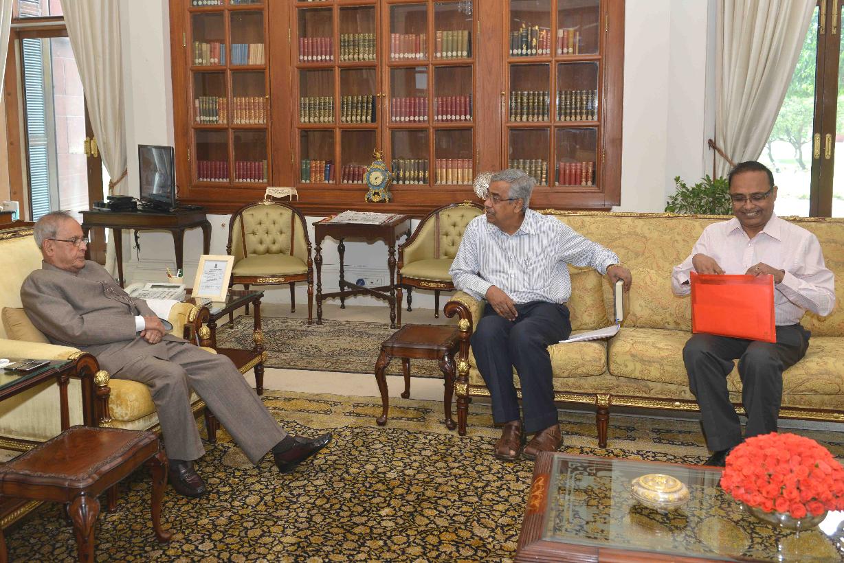 | Caption: | The President of India, Shri Pranab Mukherjee meeting the Principal, Birbhum Mahavidyalaya, Dr. Parthasarathi Mukhopadhyay and the Vice Chancellor, University of Burdwan, Prof. Smritikumar Sarkar, at Rashtrapati Bhavan, in New Delhi on July 09, 2015. |