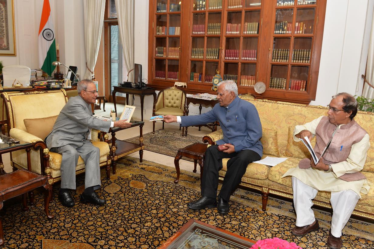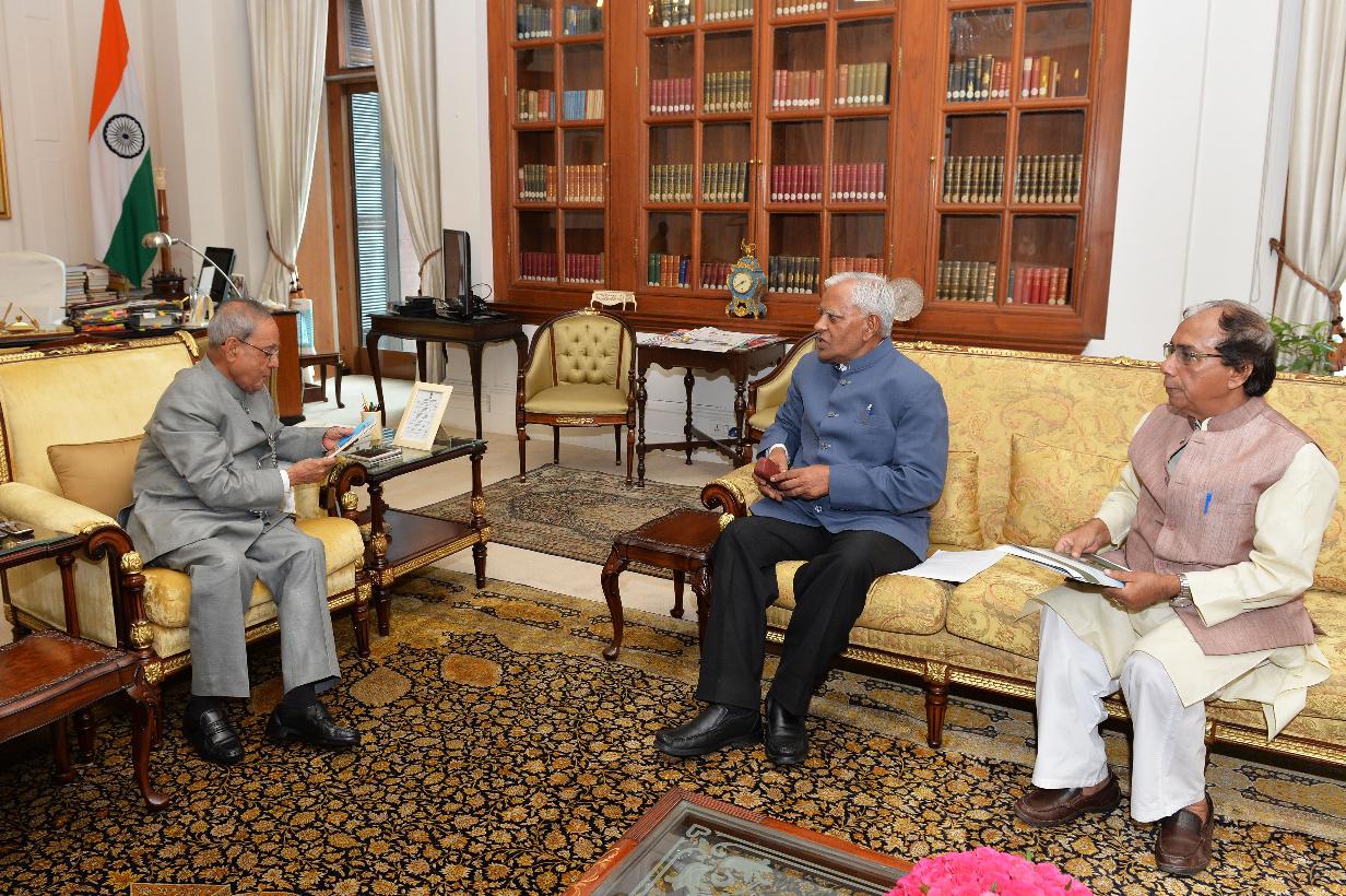 | Caption: | The President of India, Shri Pranab Mukherjee meeting Shri Justice Sakharam Yadav, former Judge, Allahabad High Court and Prof. B.B. Dutta, Ex-MP (RS), at Rashtrapati Bhavan, in New Delhi on July 16, 2015. |