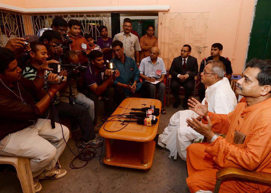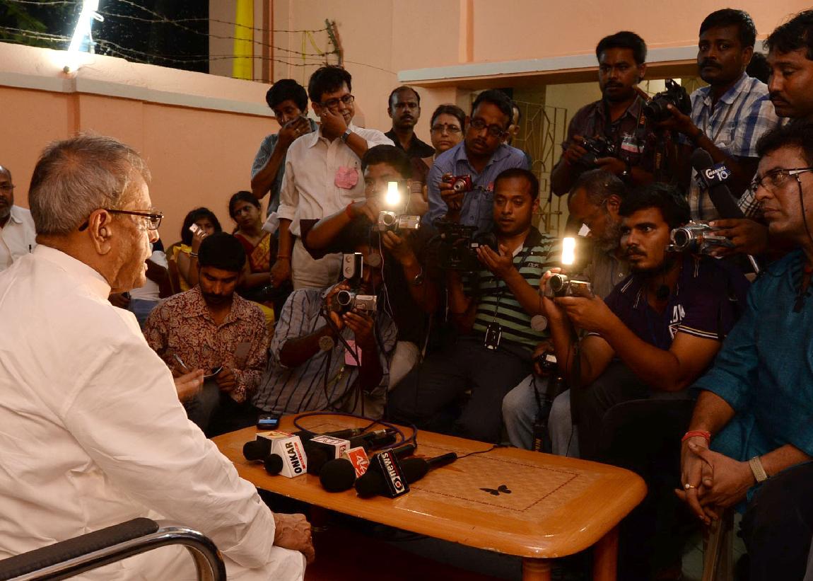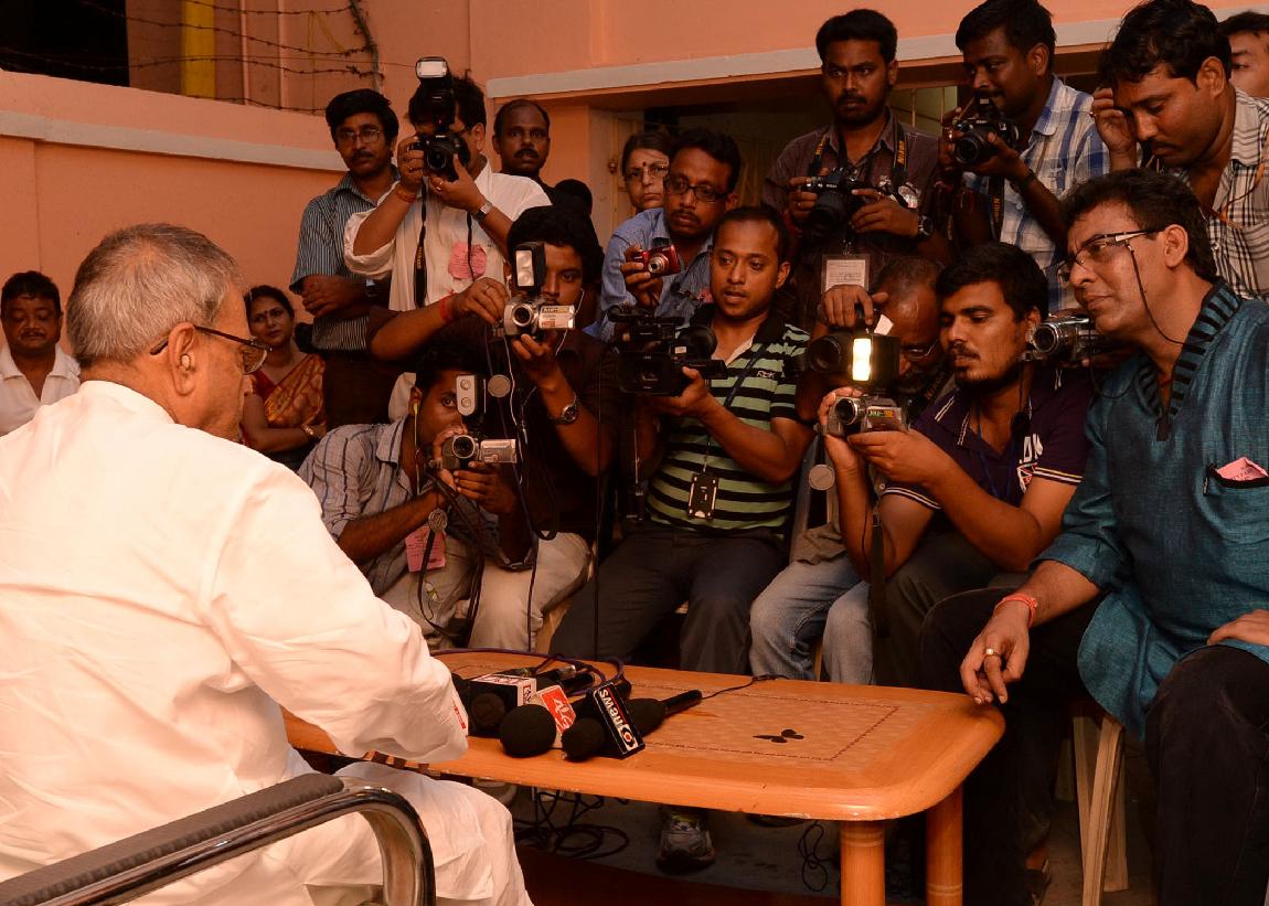 | Caption: | The President of India, Shri Pranab Mukherjee interacting with the Media Persons at his Kirnahar Residence at Kirnahar in West Bengal on Oct 11, 2013 |