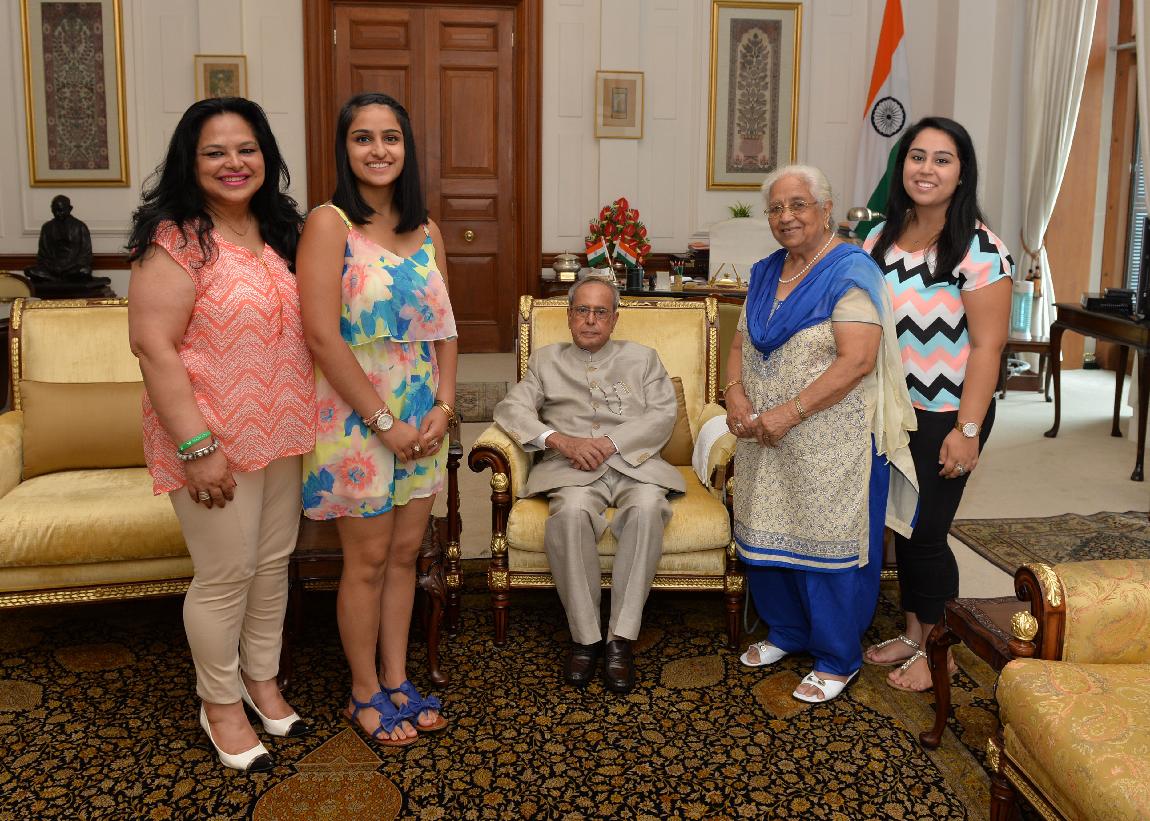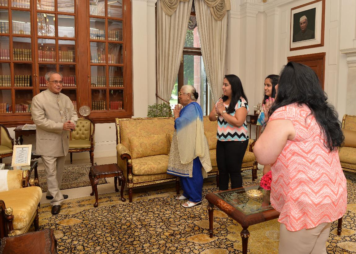| Caption: | The President of India, Shri Pranab Mukherjee meeting with Smt. Vimla Sahani (wife of late Shri Kedar Nath Sahani, former Governor) alongwith her family members, at Rashtrapati Bhavan, in New Delhi on July 22, 2015. |