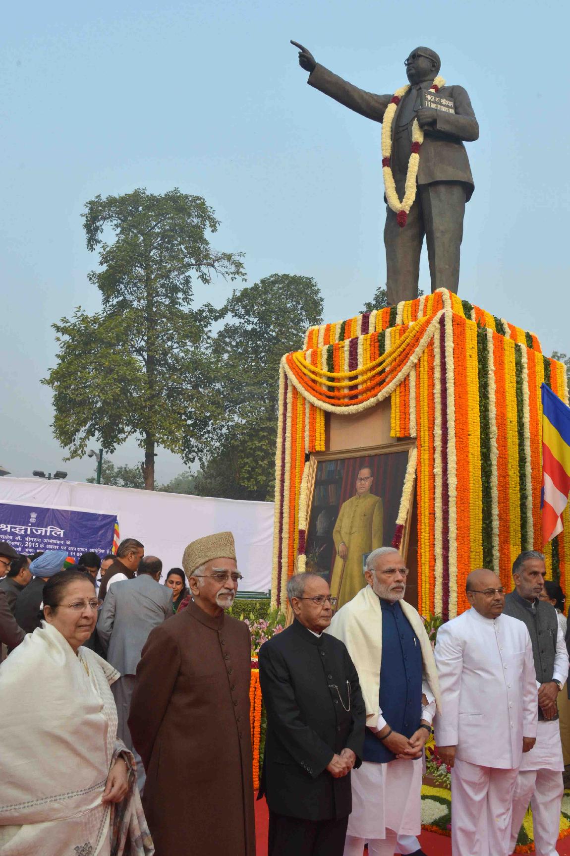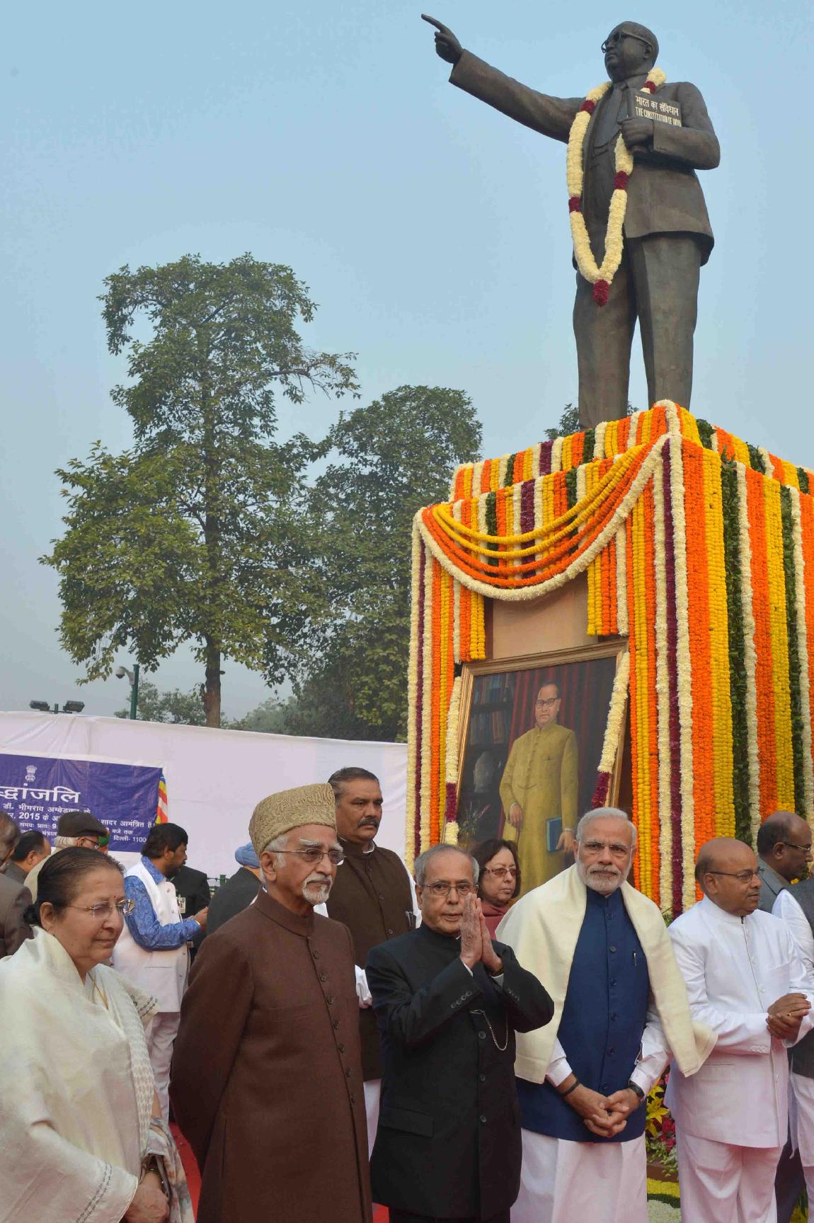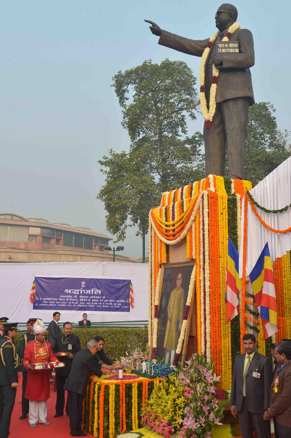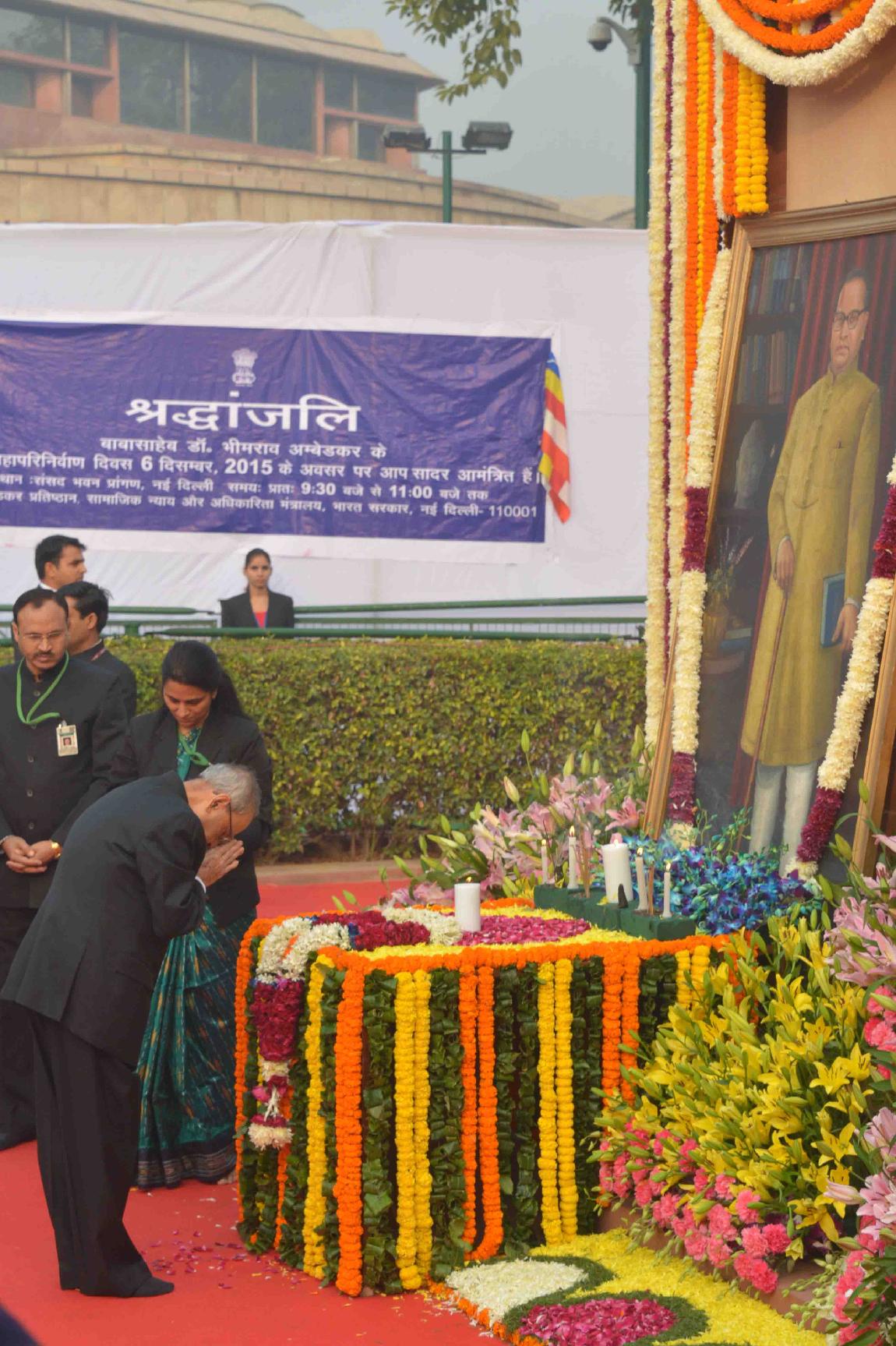 | Caption: | The President of India, Shri Pranab Mukherjee paying floral tributes at the statue of Babasaheb Dr. B.R. Ambedkar on the occasion of his Mahaparinirvan Divas, at Parliament House Lawns, in New Delhi on December 06, 2015. |