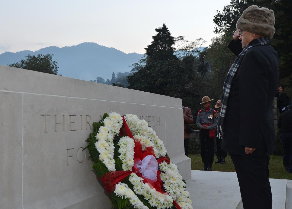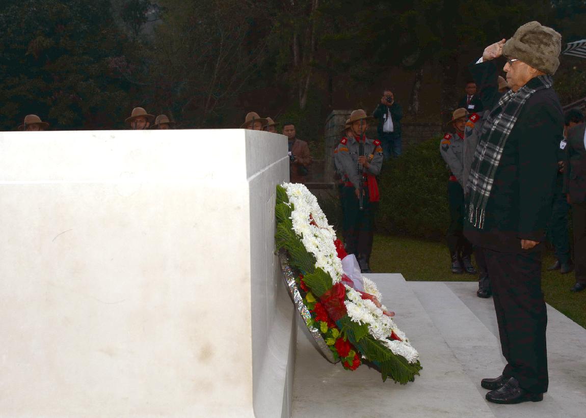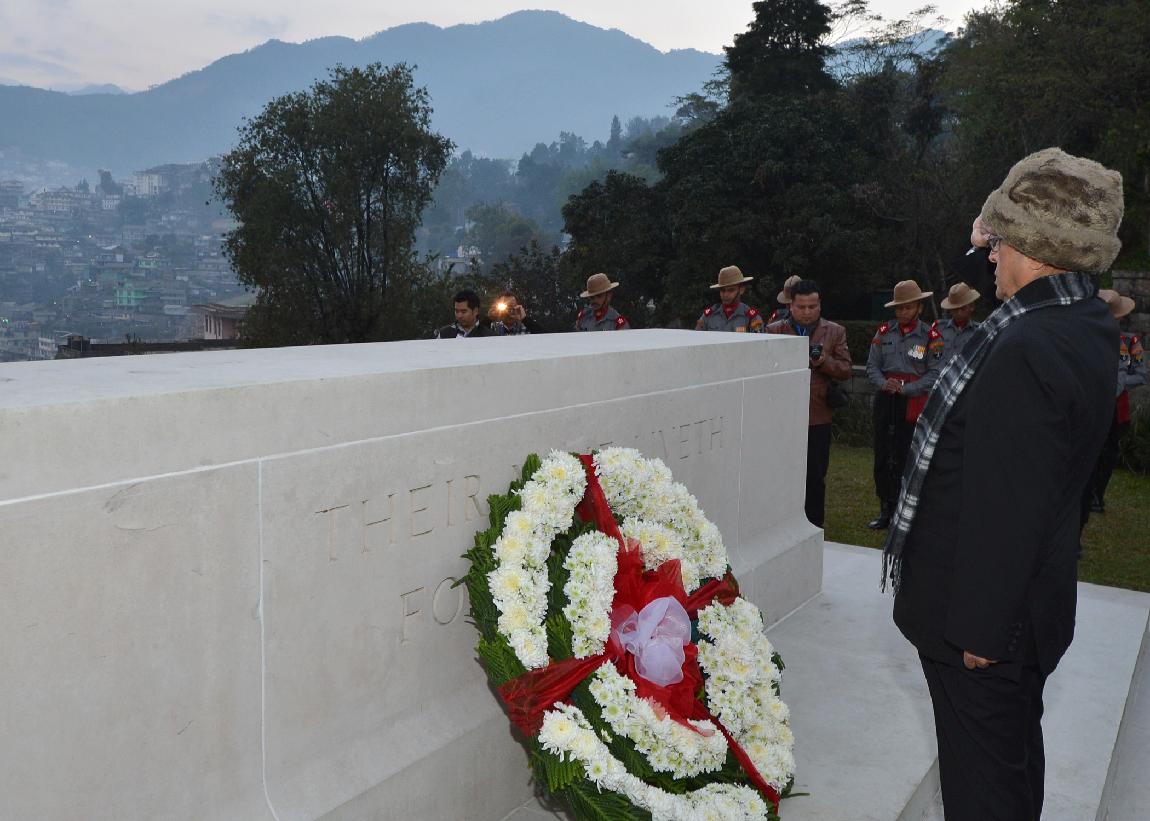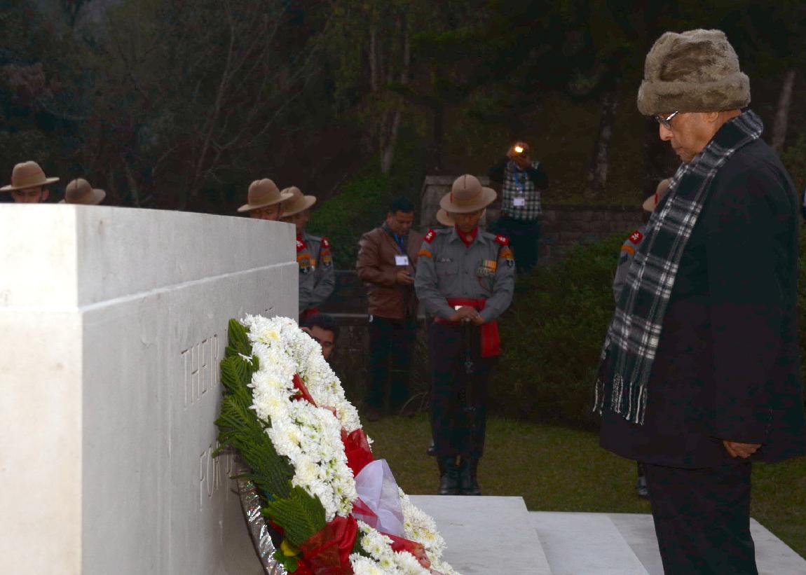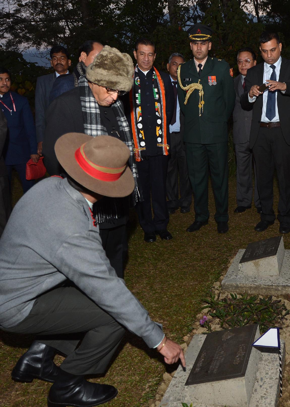 | Caption: | The President of India, Shri Pranab Mukherjee laying wreath at the War Memorial at Kohima in Nagaland on Nov 30, 2013 |
