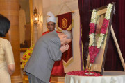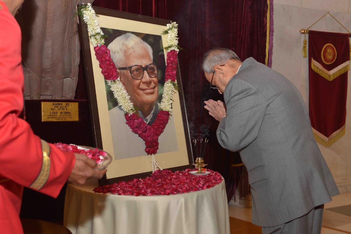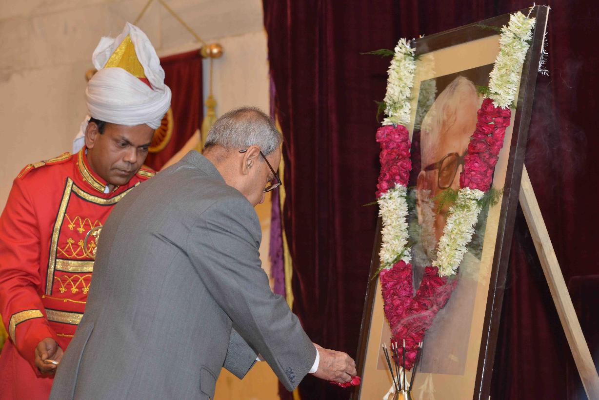 | Caption: | The President of India, Shri Pranab Mukherjee paying floral tributes at the portrait of late Shri R. Venkataraman, former President of India, on his Birth Anniversary, at Rashtrapati Bhavan on December 04, 2015. |