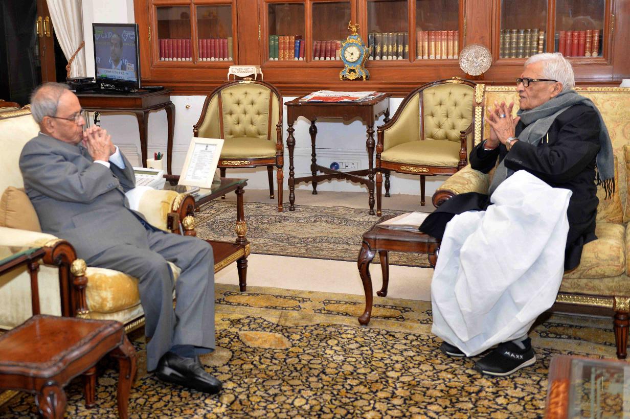 | Caption: | The President of India, Shri Pranab Mukherjee meeting with Dr. Jagannath Mishra, former Chief Minister of Bihar, at Rashtrapati Bhavan on December 08, 2015. |