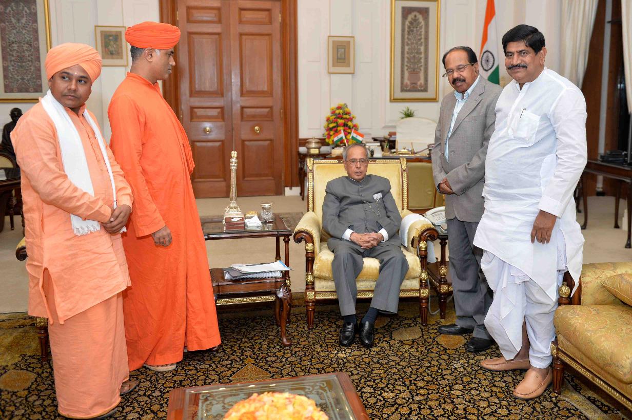 | Caption: | The President of India, Shri Pranab Mukherjee meeting with Dr. M. Veerappa Moily, MP(LS) alongwith Shri Gaddigoudar, MP (LS), Dr. Siddhalinga Swamigalu and Shri Sharanabasava Devaru from Viraktsa Matta, Ingleshwara, Karnataka, at Rashtrapati Bhavan on December 08, 2015. |