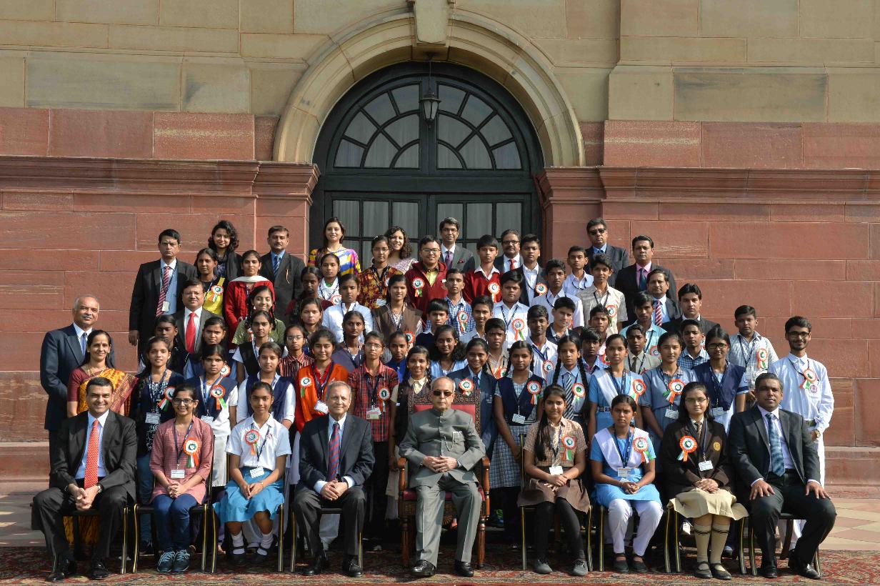 | Caption: | The President of India, Shri Pranab Mukherjee with the winners of the 2012-13 & 2013-14 Nationwide 'Tata Building India School Essay Competition', at Rashtrapati Bhavan on December 04, 2015. |