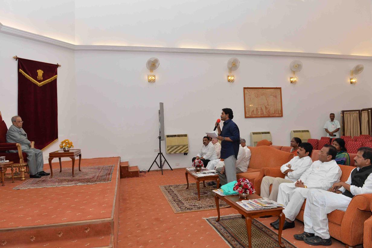 | Caption: | The President of India, Shri Pranab Mukherjee meeting with Shri Y.S. Jagan Mohan Reddy with others, at Rashtrapati Nilayam, Bolarum, in Secunderabad on December 20, 2015. |