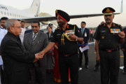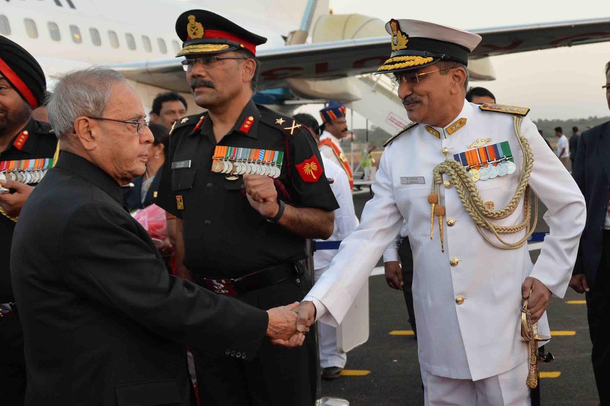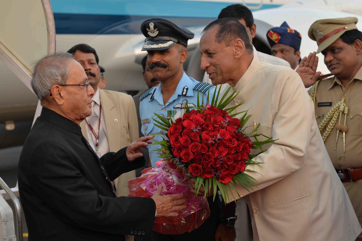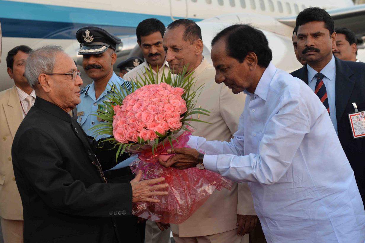 | Caption: | The President of India, Shri Pranab Mukherjee being received by the Governor of Andhra Pradesh and Telangana, Shri ESL Narasimhan and the Chief Minister of Telangana, Shri K. Chandrashekar Rao, on his arrival, at Hakimpet Airport, in Hyderabad on December 18, 2015. |
