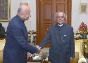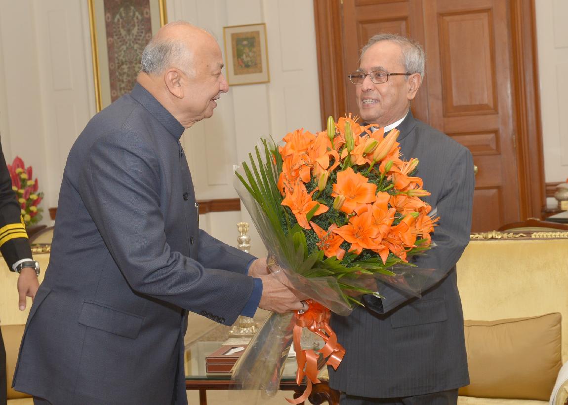 | Caption: | The President of India, Shri Pranab Mukherjee being greeted by the former Union Home Minister, Shri Sushilkumar Shinde, on the occasion of his 80th birthday, at Rashtrapati Bhavan on December 11, 2015 . |