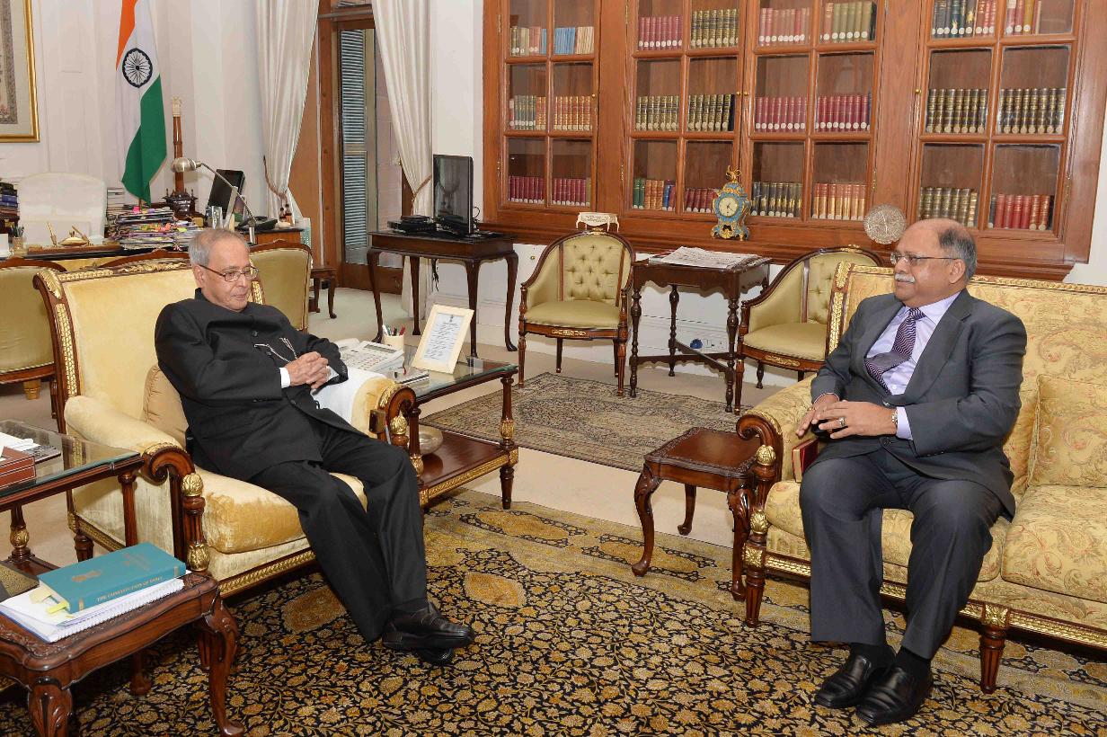 | Caption: | The President of India, Shri Pranab Mukherjee meeting with Shri Ranjit Kumar, Solicitor General of India, at Rashtrapati Bhavan on December 18, 2015. |