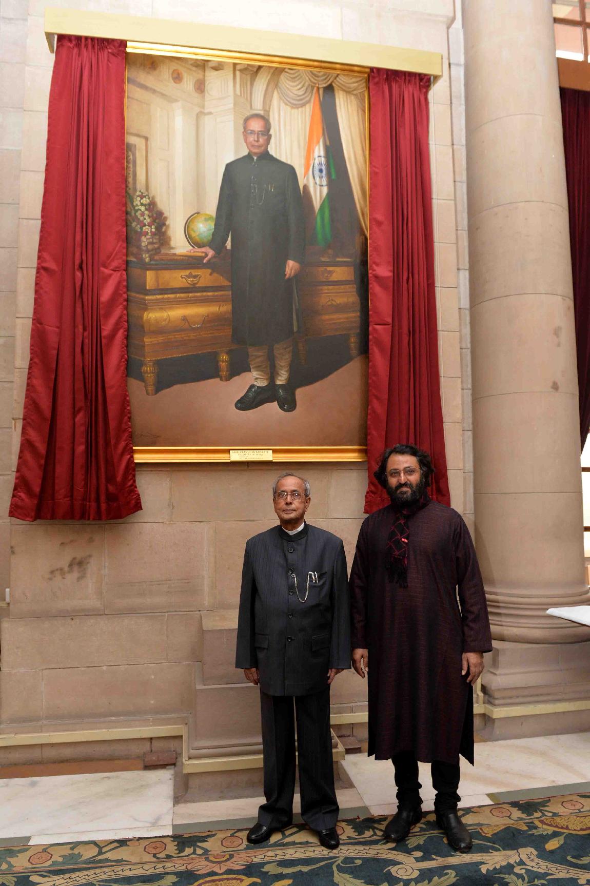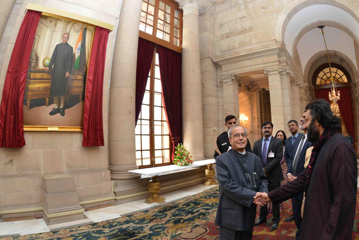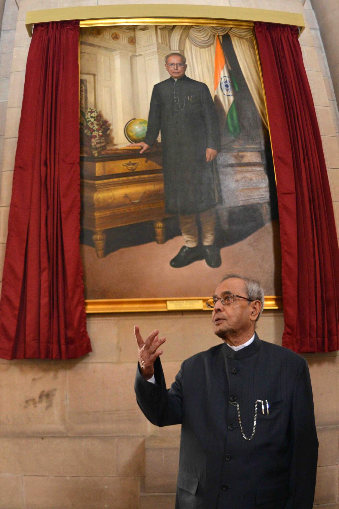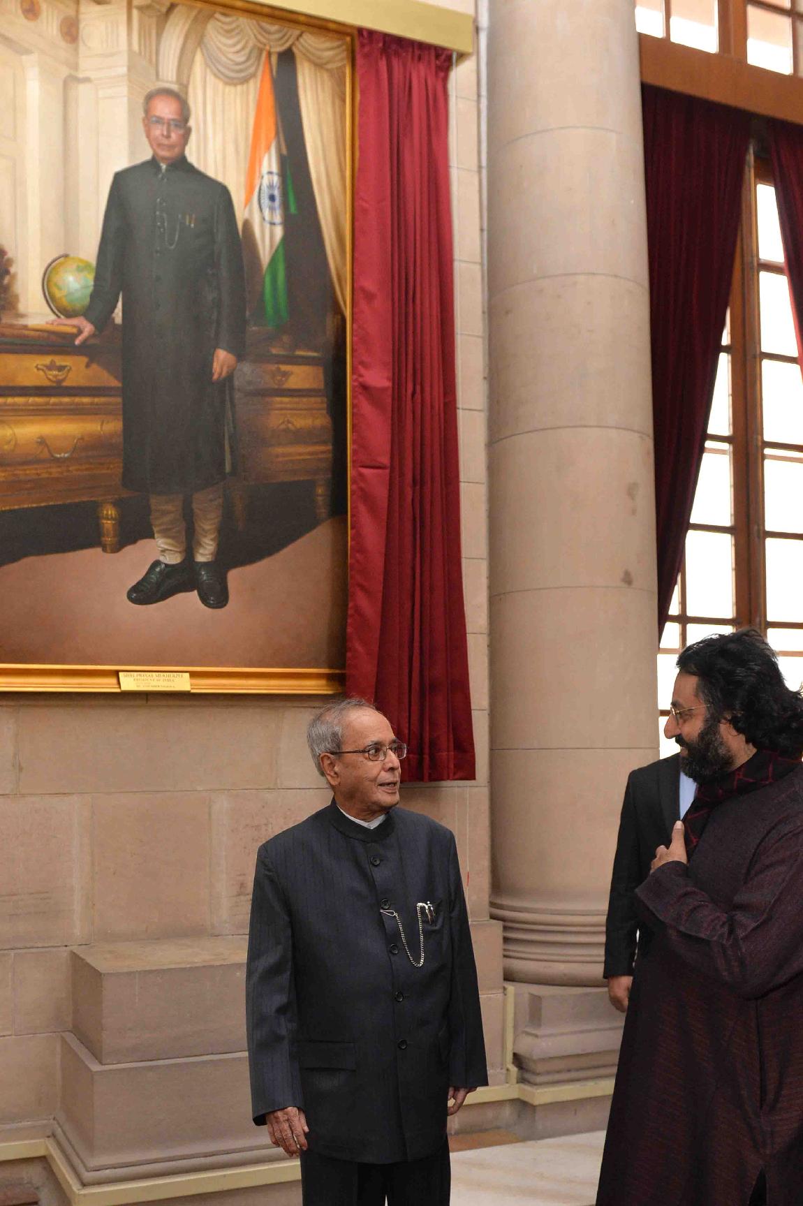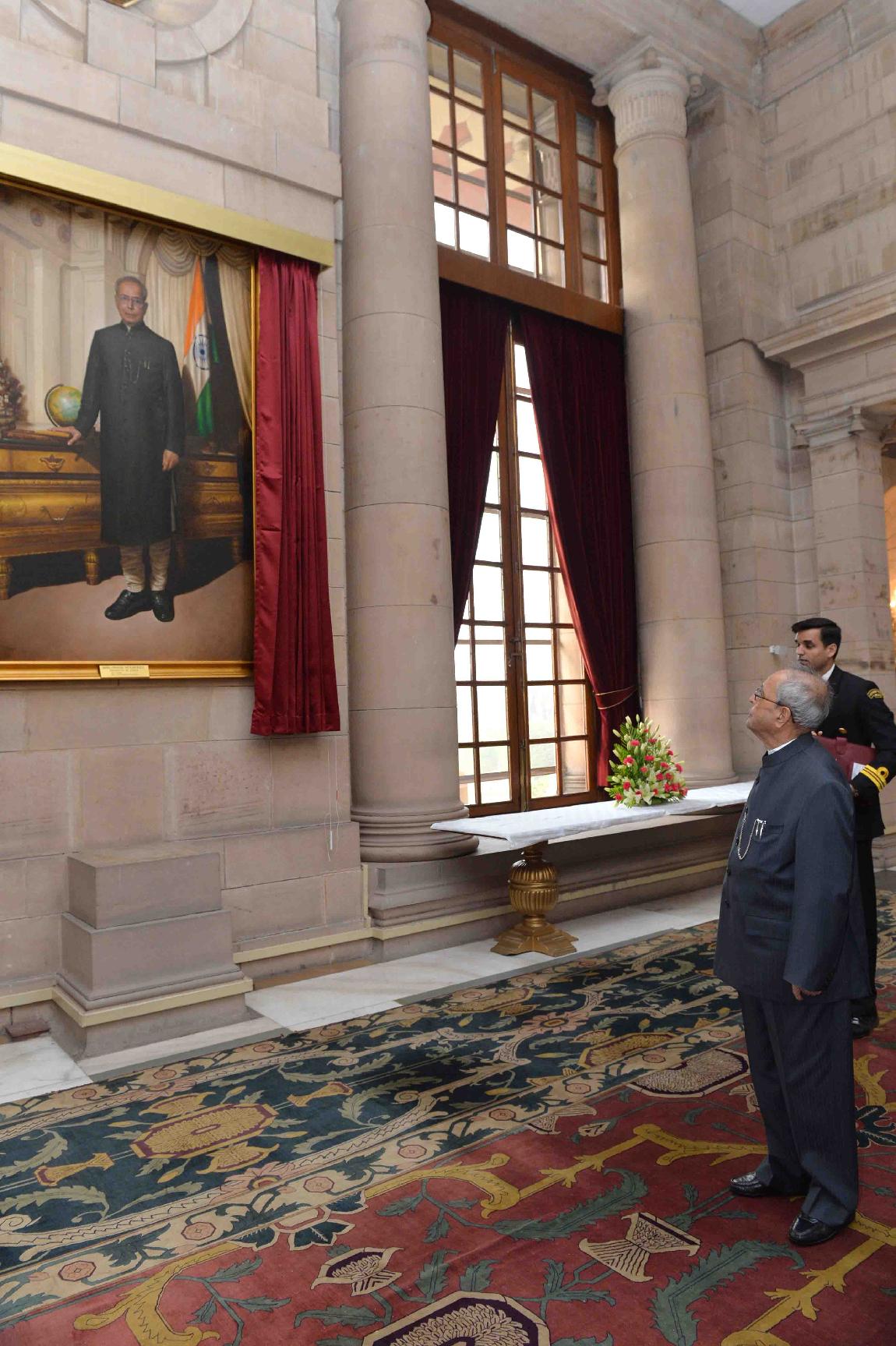 | Caption: | The President of India, Shri Pranab Mukherjee, viewing the inaugurated portrait of the President (Shri Pranab Mukherjee) at Rashtrapati Bhavan on December 11, 2015. |