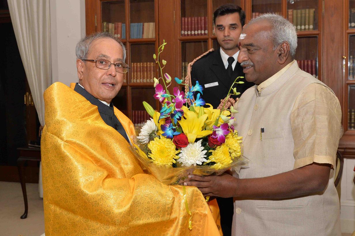 | Caption: | The President of India, Shri Pranab Mukherjee being greeted by the Minister of State for Road Transport and Highways, Shri Pon. Radhakrishnan on the occasion of his 80th birthday, at Rashtrapati Bhavan on December 11, 2015 . |