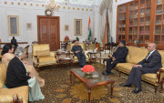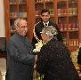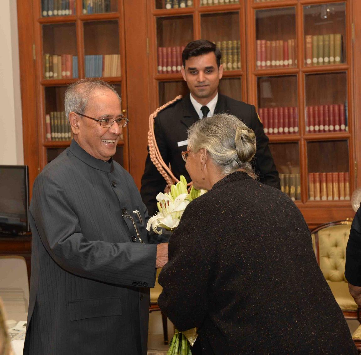 | Caption: | The President of India, Shri Pranab Mukherjee being greeted by Dr. MM Pallam Raju, former Union Minister and Smt. Sheila Dikshit, Ex-Governor of Kerala, on the occasion of his 80th birthday, at Rashtrapati Bhavan on December 11, 2015 . |