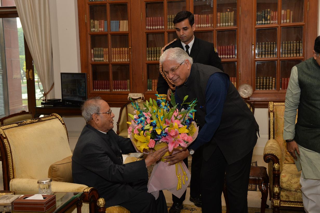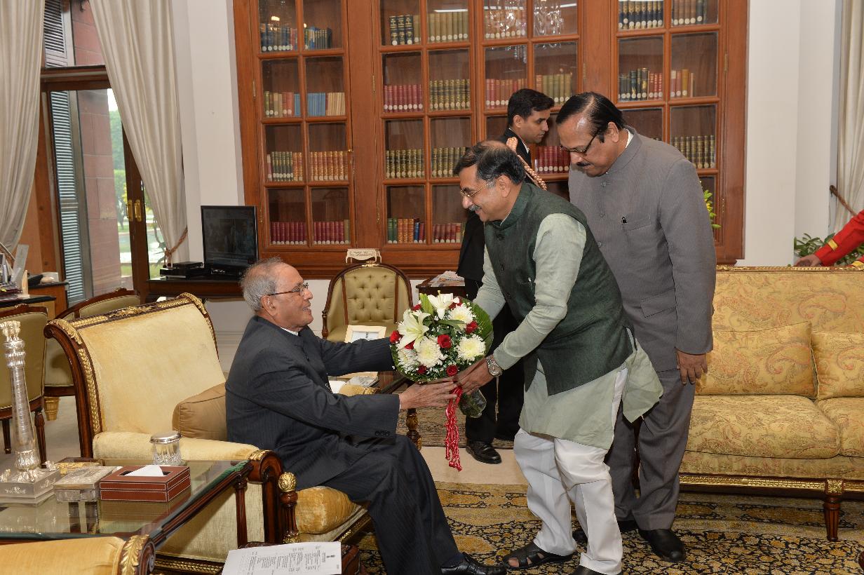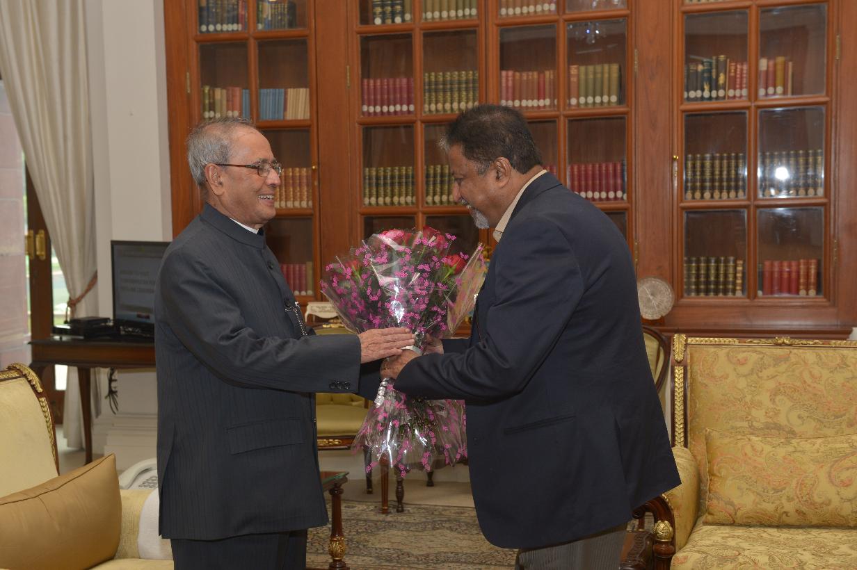 | Caption: | The President of India, Shri Pranab Mukherjee being greeted by the Members of Parliament, Rajya Sabha, Shri Sukhendu Sekhar Roy, Shri Tarun Vijay, Shri Ashwani Kumar, Shri Sitaram Yechury and Shri Mukul Roy, on the occasion of his 80th birthday, at Rashtrapati Bhavan on December 11, 2015 . |