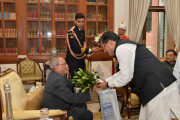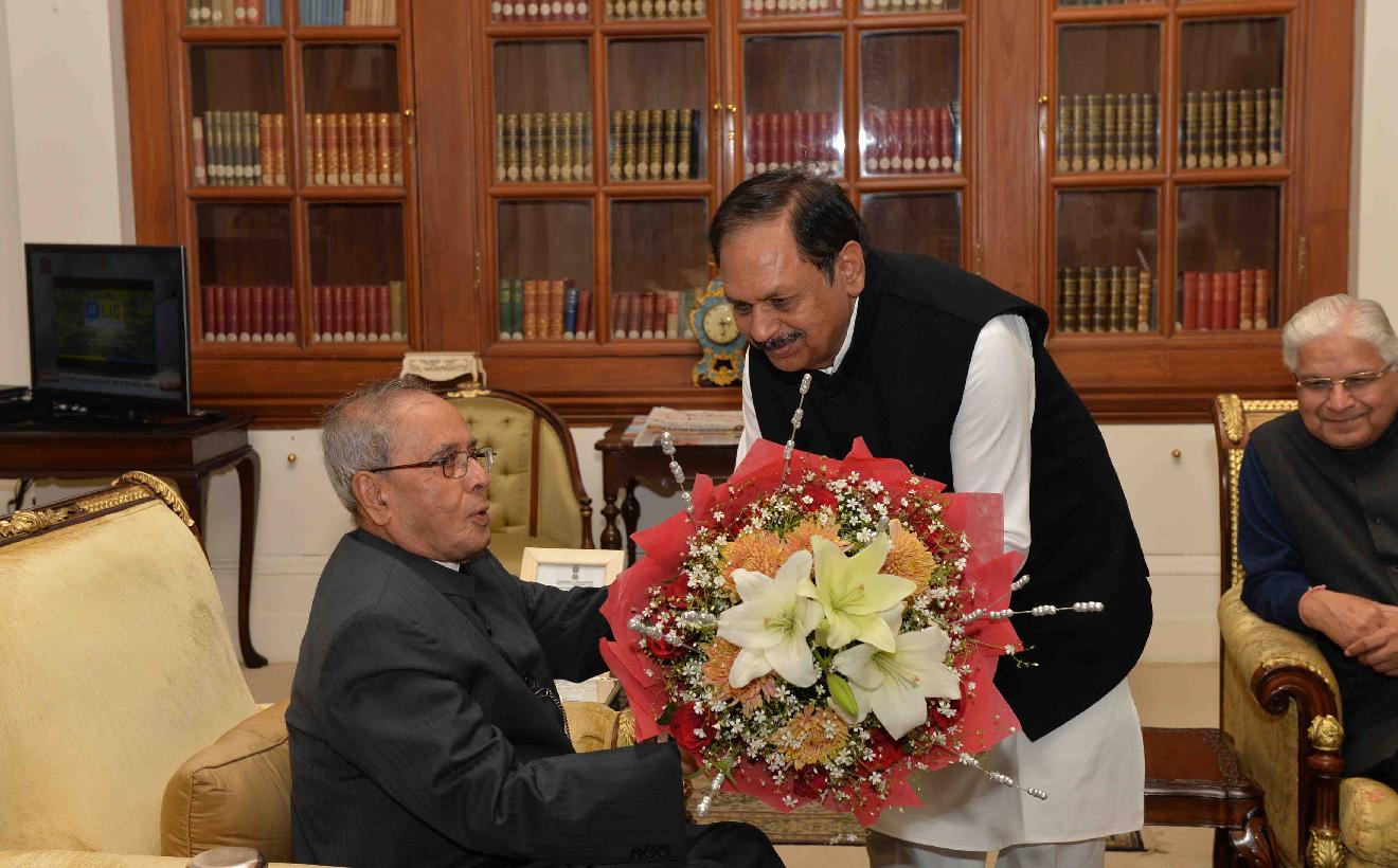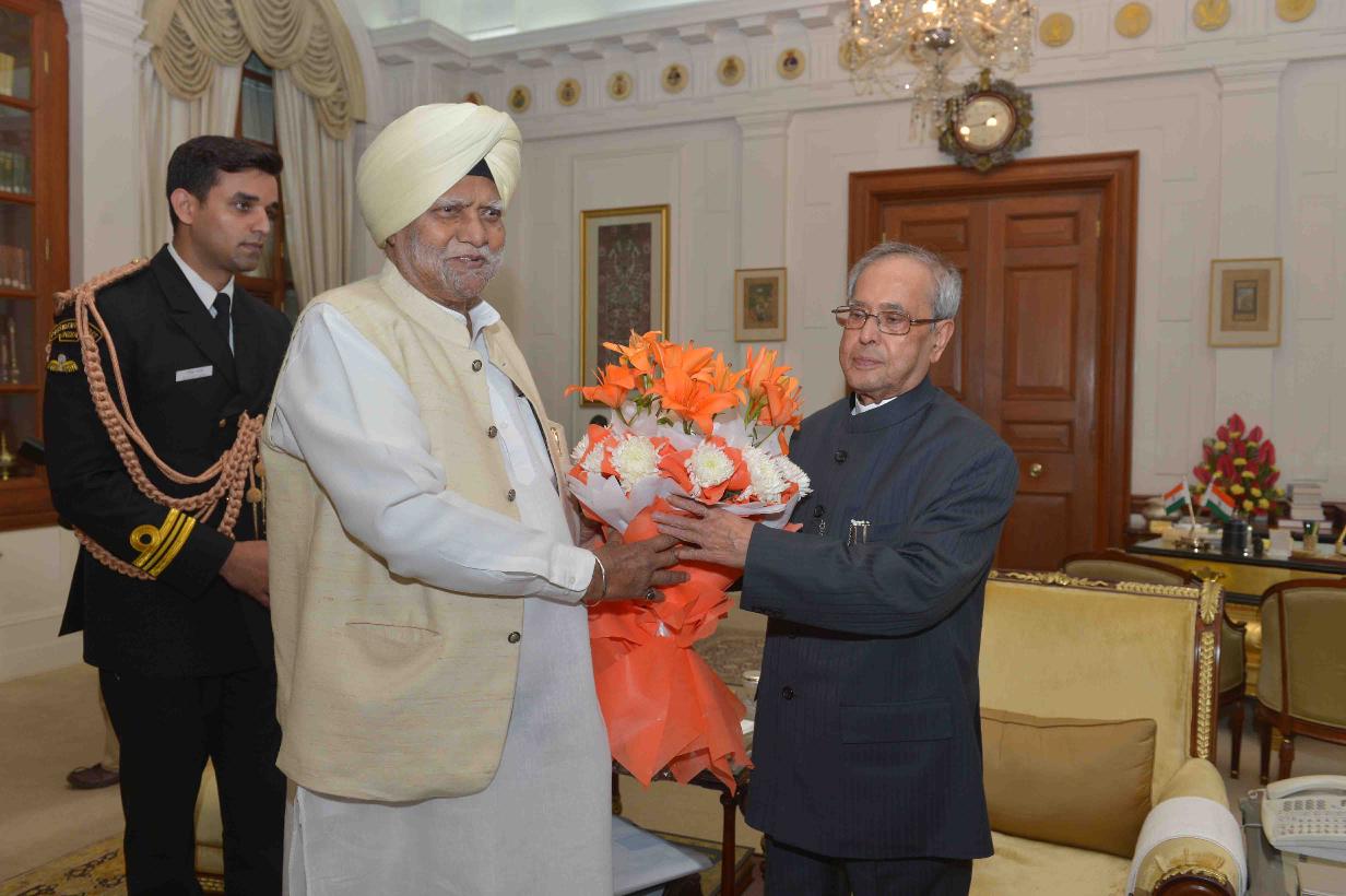 | Caption: | The President of India, Shri Pranab Mukherjee being greeted by the former Union Ministers, Shri Suresh Pachauri, Shri Mukul Wasnik and Shri Buta Singh, on the occasion of his 80th birthday, at Rashtrapati Bhavan on December 11, 2015 . |