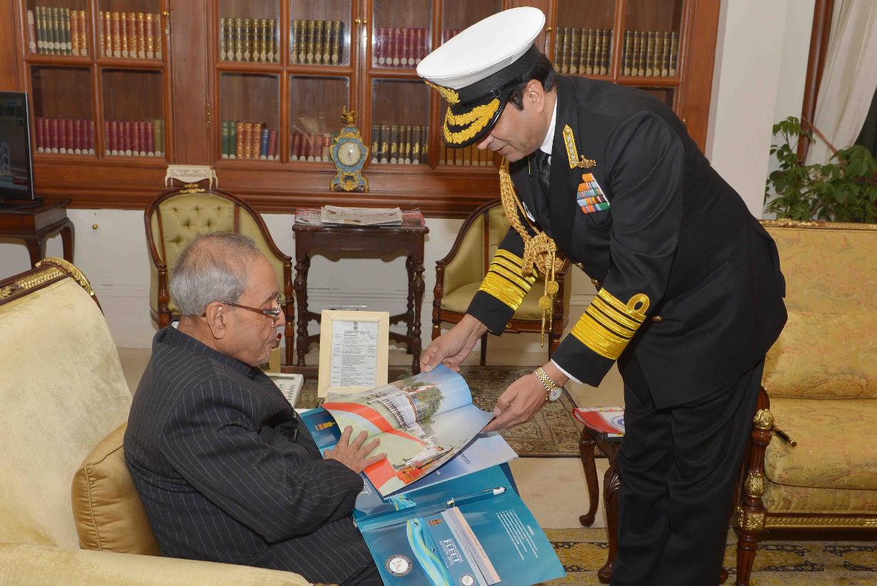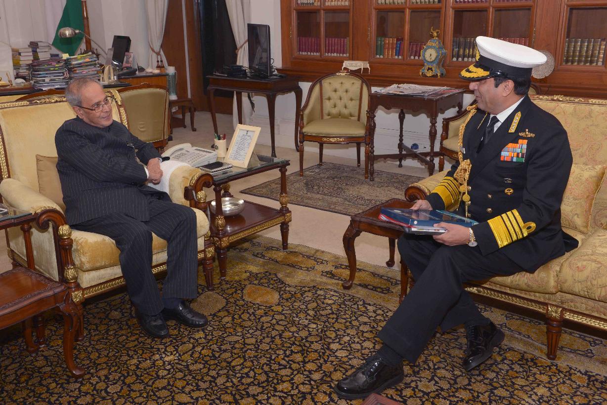 | Caption: | The President of India, Shri Pranab Mukherjee meeting with Admiral R.K. Dhowan, Chief of the Naval Staff, at Rashtrapati Bhavan on January 20, 2016. |