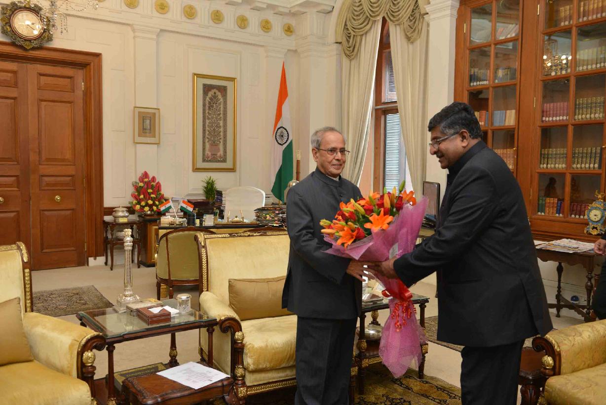 | Caption: | The President of India, Shri Pranab Mukherjee being greeted by the Minister of Communications & IT, Shri Ravishankar Prasad, on the occasion of his 80th birthday, at Rashtrapati Bhavan on December 11, 2015 . |