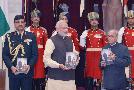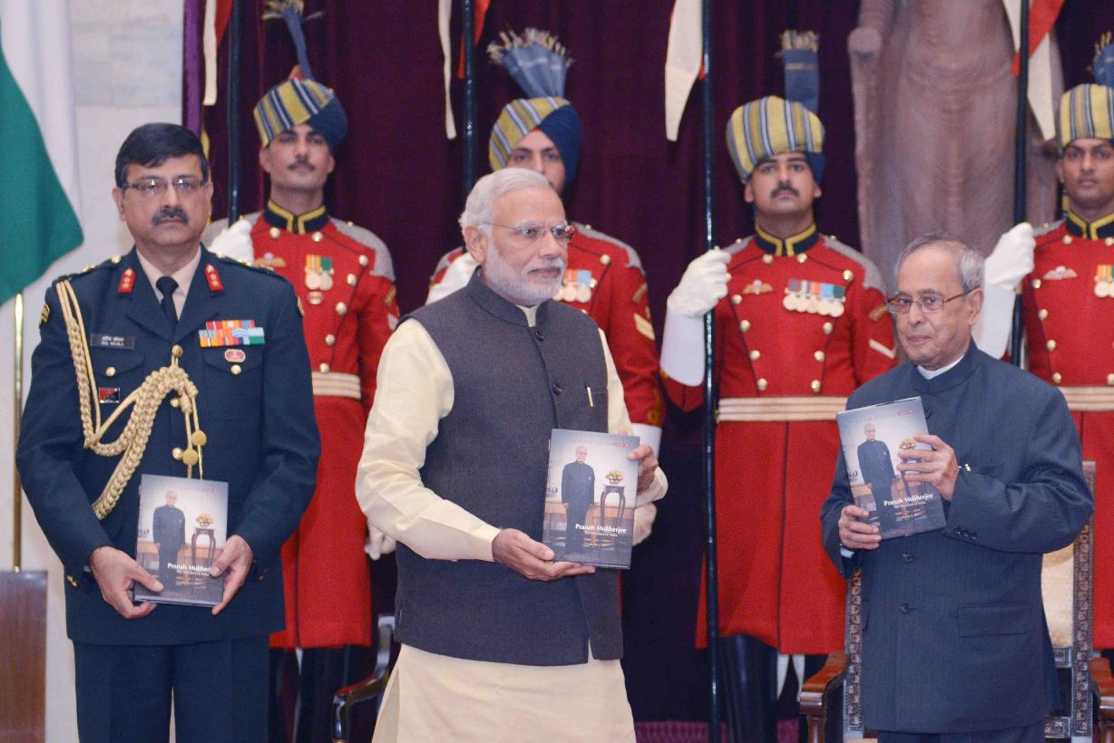 | Caption: | The President of India, Shri Pranab Mukherjee receiving the first copies of the books Selected Speeches of the President Vol. III and Presidential Retreats from the Prime Minister, Shri Narendra Modi, at Rashtrapati Bhavan on December 11, 2015 . |