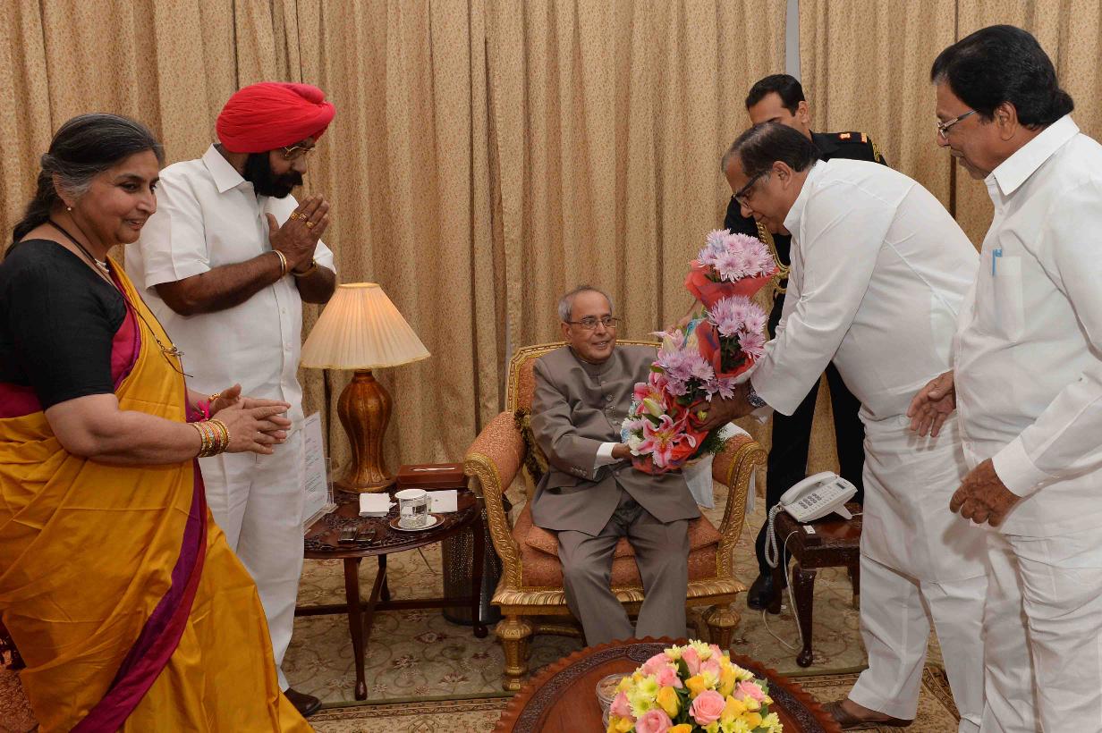 | Caption: | The President of India, Shri Pranab Mukherjee meeting with Shri Abid Rasool Khan with others, at Rashtrapati Nilayam, Bolarum, in Secunderabad on December 26, 2015. |