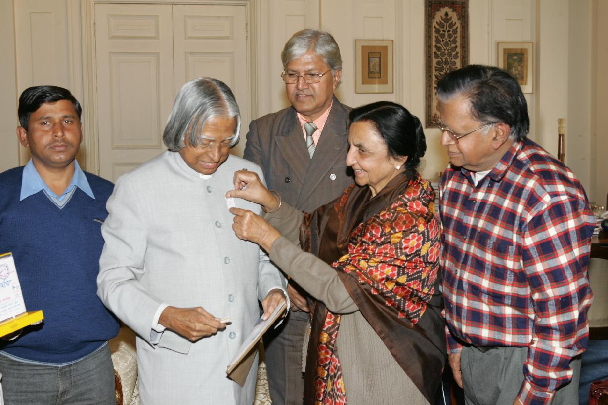 | Caption: | The President of India, Dr A P J Abdul Kalam with the Members of All India Federation of the Deaf to pining a Flag to the President at Rashtrapati Bhavan in New Delhi on Feb 03, 2005 |