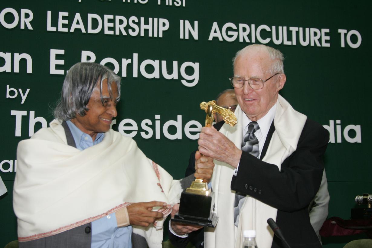 | Caption: | The President of India, Dr A P J Abdul Kalam presenting the First Dr Ms Swaminathan Award to Dr Normon E Borlaug at Vigyan Bhavan in New Delhi on March 15, 2005 |