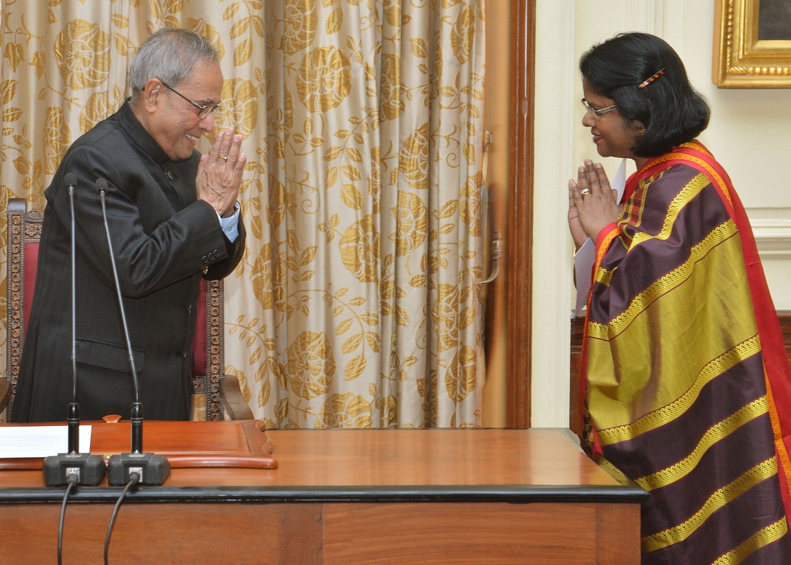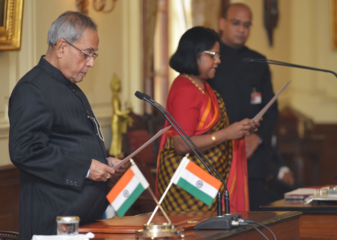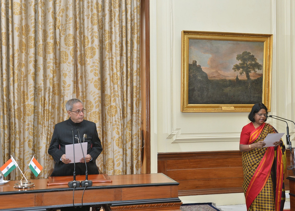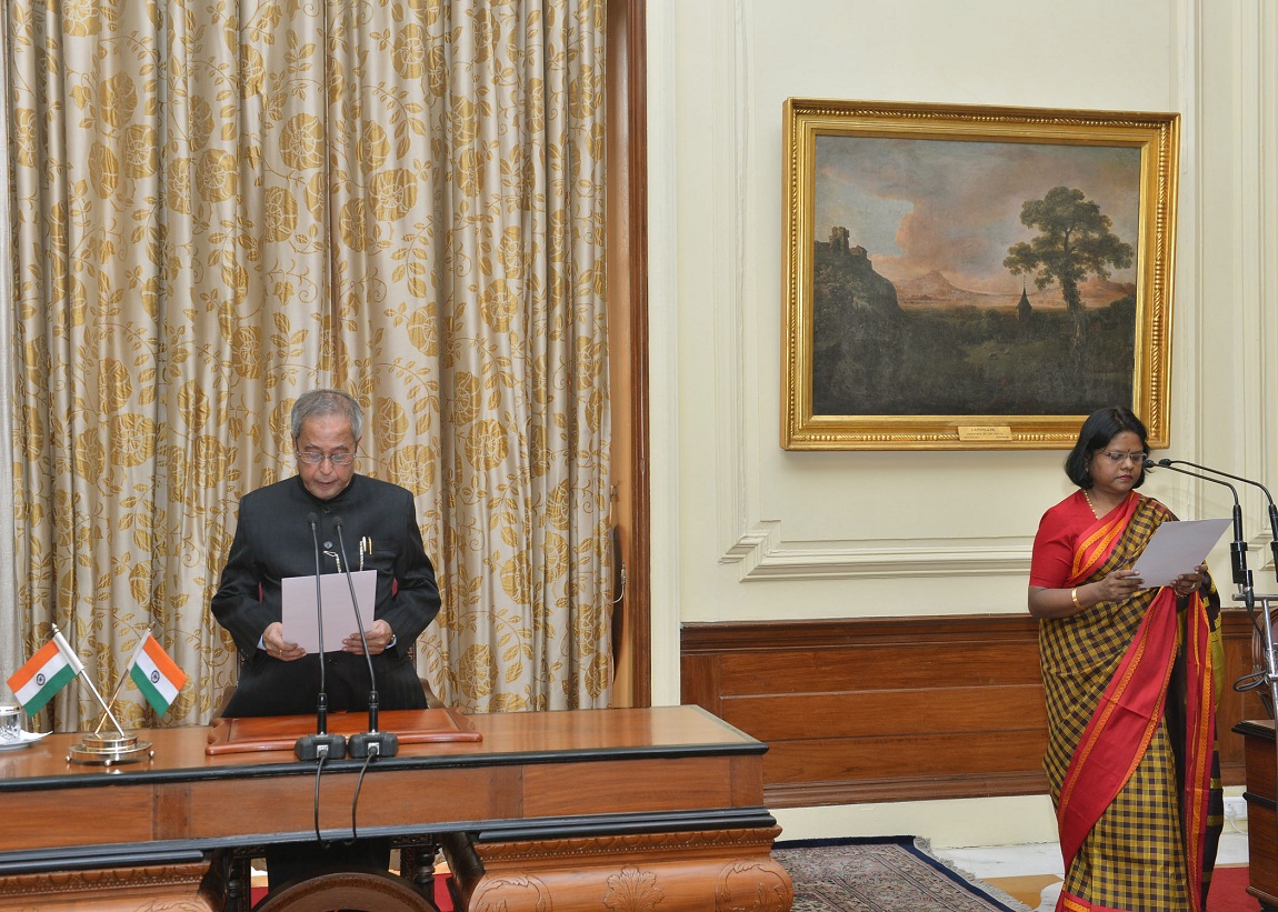 | Caption: | The President of India, Shri Pranab Mukherjee administering the Oath of Office to the Chief Information Commissioner, Smt Sushma Singh at a Swearing-in-Ceremony at Rashtrapati Bhavan in New Delhi on Dec 19, 2013 |