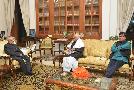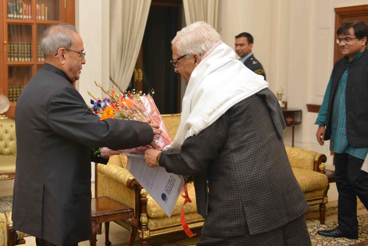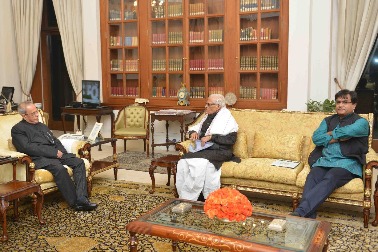 | Caption: | The President of India, Shri Pranab Mukherjee meeting with Dr. Jagannath Mishra, former Chief Minister of Bihar along with his son Shri Manish Mishra, on the occasion of New Year, at Rashtrapati Bhavan on January 01, 2016. |