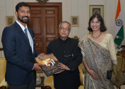 | Caption: | The Lt Cdr Abhilash Tomy, Author, Ms Lynn De Souza, Co-Author presenting a Copy of the Book 151 to the President of India, Shri Pranab Mukherjee at Rashtrapati Bhavan in New Delhi on Dec 18, 2013 |
