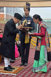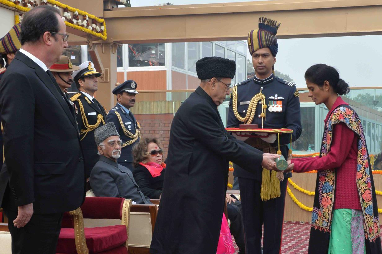 | Caption: | The President of India, Shri Pranab Mukherjee conferring the Ashoka Chakra (the highest peacetime gallantry award) posthumously on Lance Naik Mohan Nath Goswami of 9 Para (Special Forces) at the 67th Republic Day Parade in New Delhi on January 26, 2016. The award is being received by his Wife. |