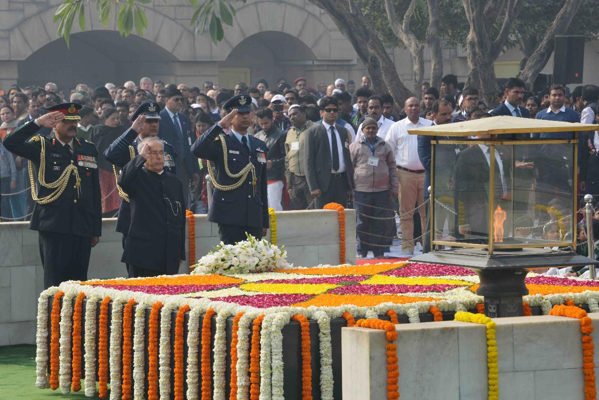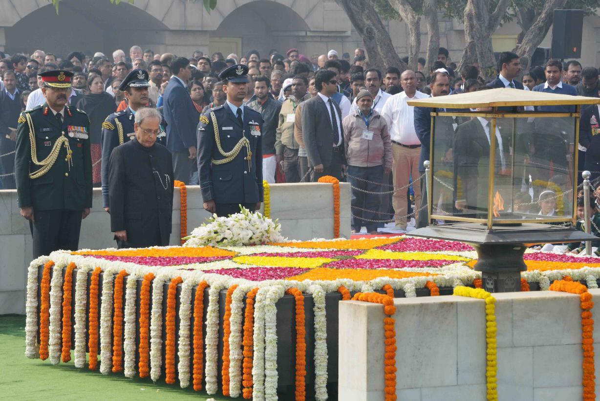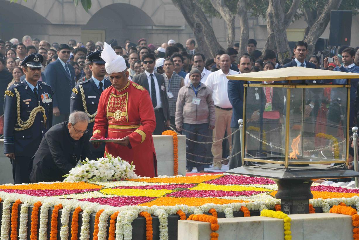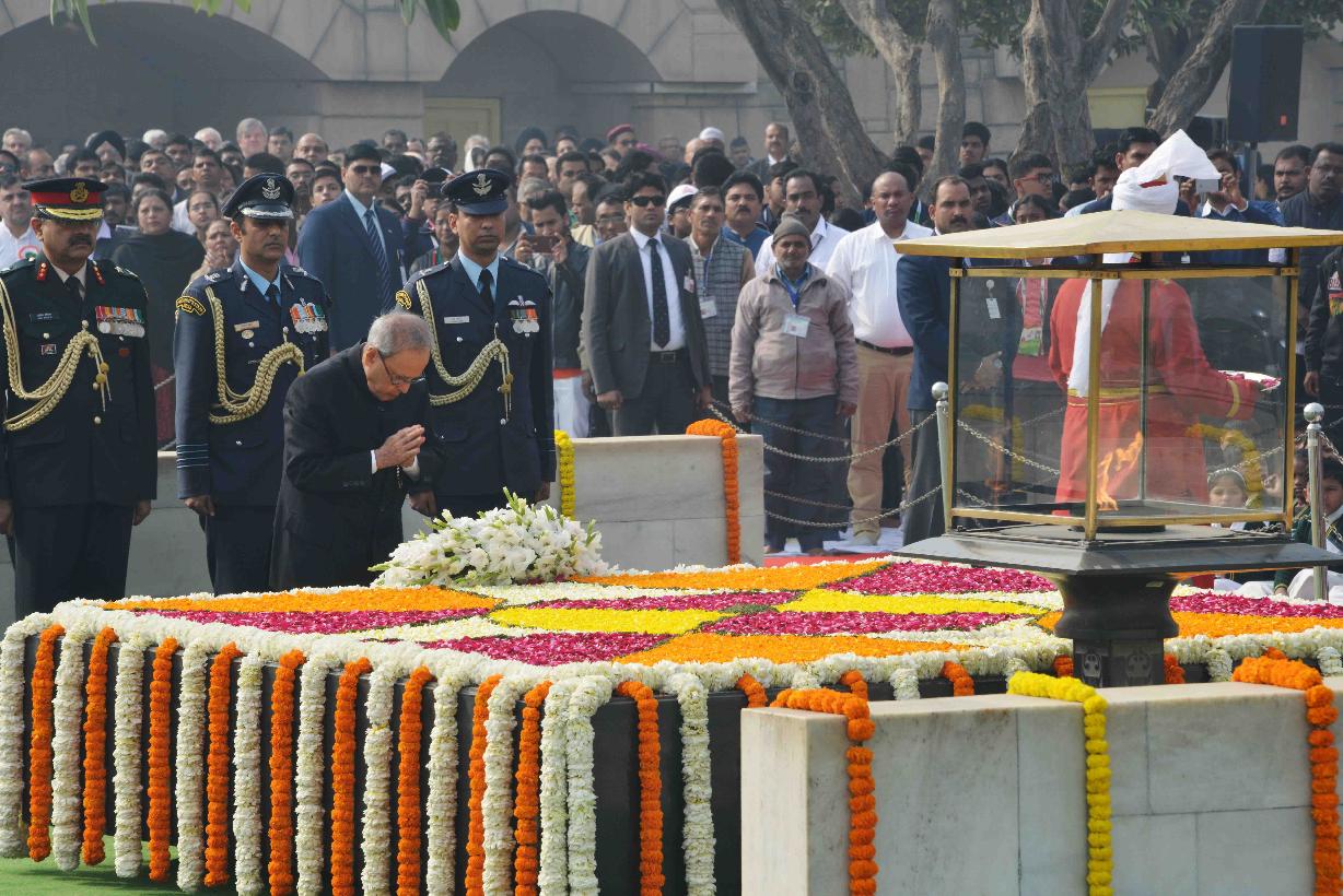 | Caption: | The President of India, Shri Pranab Mukherjee paying homage at the Samadhi of the Father of the Nation, Mahatma Gandhi on the occasion of his 68th Death Anniversary, at Raj Ghat, in Delhi on January 30, 2016 . |